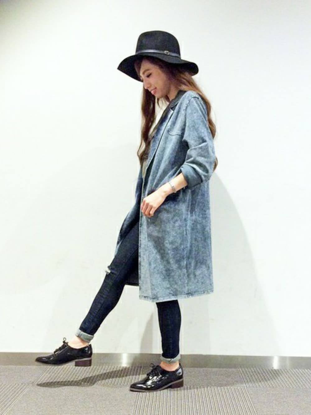 抵抗しがちなデニムONデニムですが、色や素材違いでならビギナーでもしやすいですよ♪ チェスターコートはカット素材なので重くならなくて◎ 丈の長めのコートにロールアップのスキニーデニム、これだけでバランスがとってもよく見えますよヽ(*´∇`)ノ