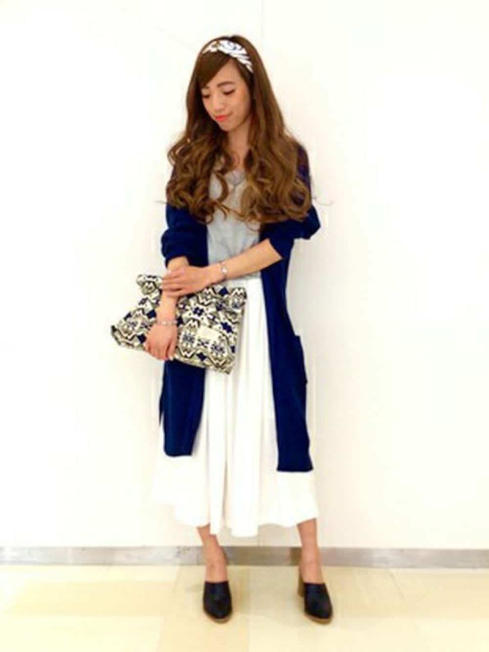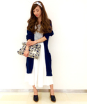 スカートのようにボリュームのあるワイドパンツにロングカーデの組み合わせ(★´3`)ノ パンツに合わせるコーデもいいけど、フェミニンで上品に仕上がります♪ 雰囲気のあるサボサンダルとネイティブ柄のクラッチでよりおしゃれ感UPしてください☆*★*♪
