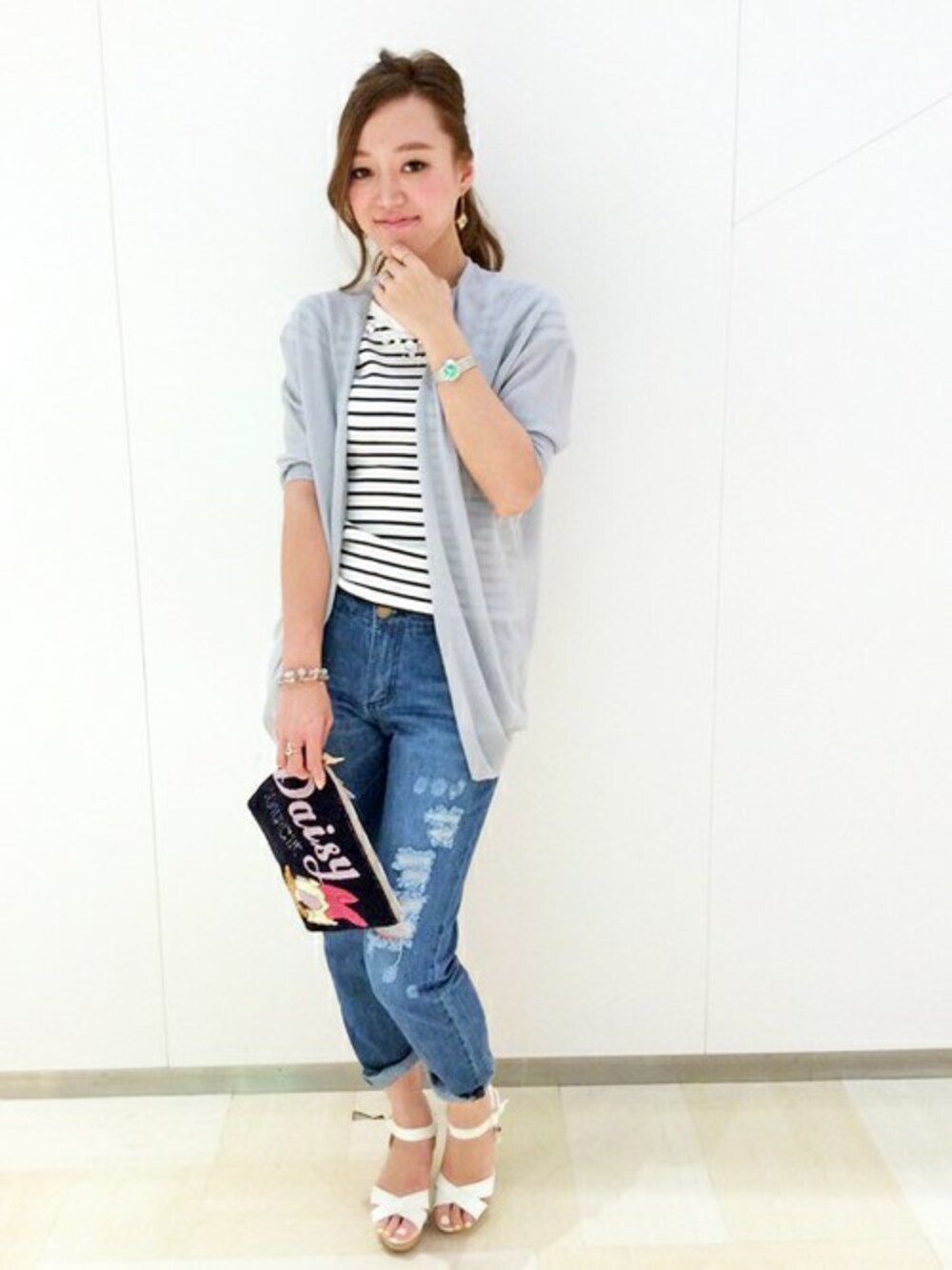 温度差がある今の季節、安心して脱ぎ着できる軽さがうれしいカーディガンはプチプラの3800円!! インナーにボーダーを合わせて重くならないよう着こなしました^^ トレンドのダメージデニムはロールアップ幅をルーズにすることでカジュアルになりすぎずに着れます♪