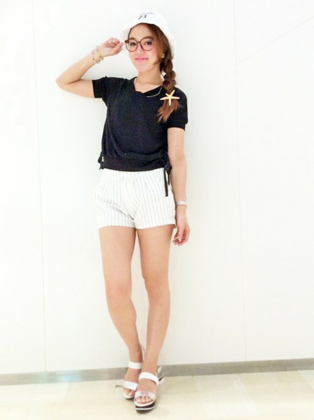 トップスは今季トレンドの両脇の裾をグログランテープでレースアップした、フェミニンなデザイン♪ オフショルとして2WAYでも楽しめちゃいますよ^^ ストライプのショーパンを合わせてモノトーンに着こなしました☆