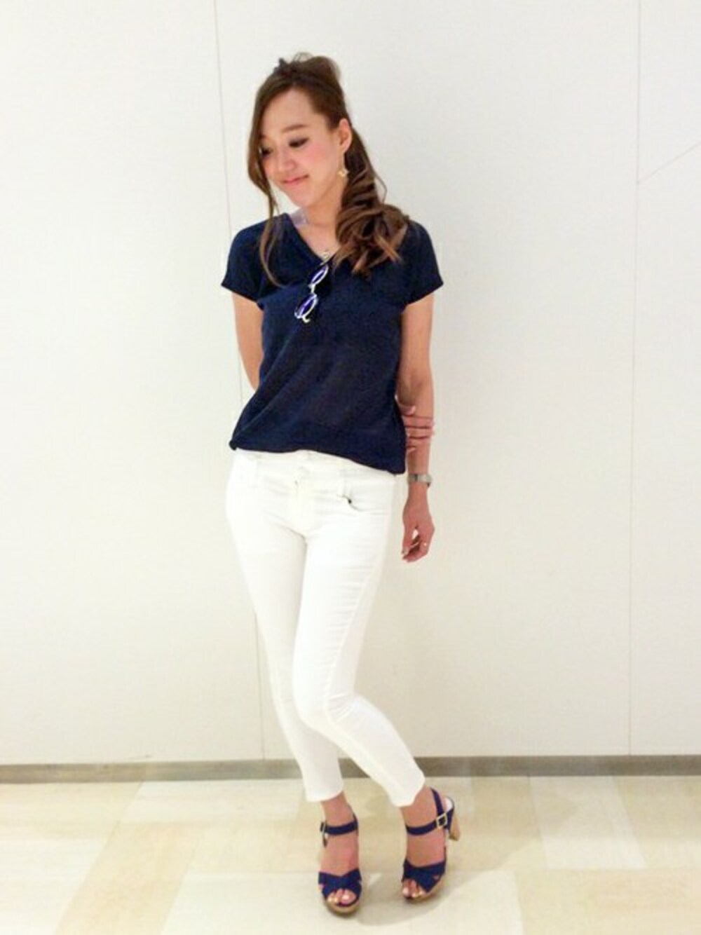 夏らしく爽やかにブルー&白でまとめてみました☆ 今年はやりの、ミラーサングラスで夏気分も↑up TOPSは背中の覗くヘルシーなバックスタイルで、グログランテープのレースアップで後ろ姿も女性らしくデザイン♪ 前後でガラリと変わる表情がポイントです!(^^)