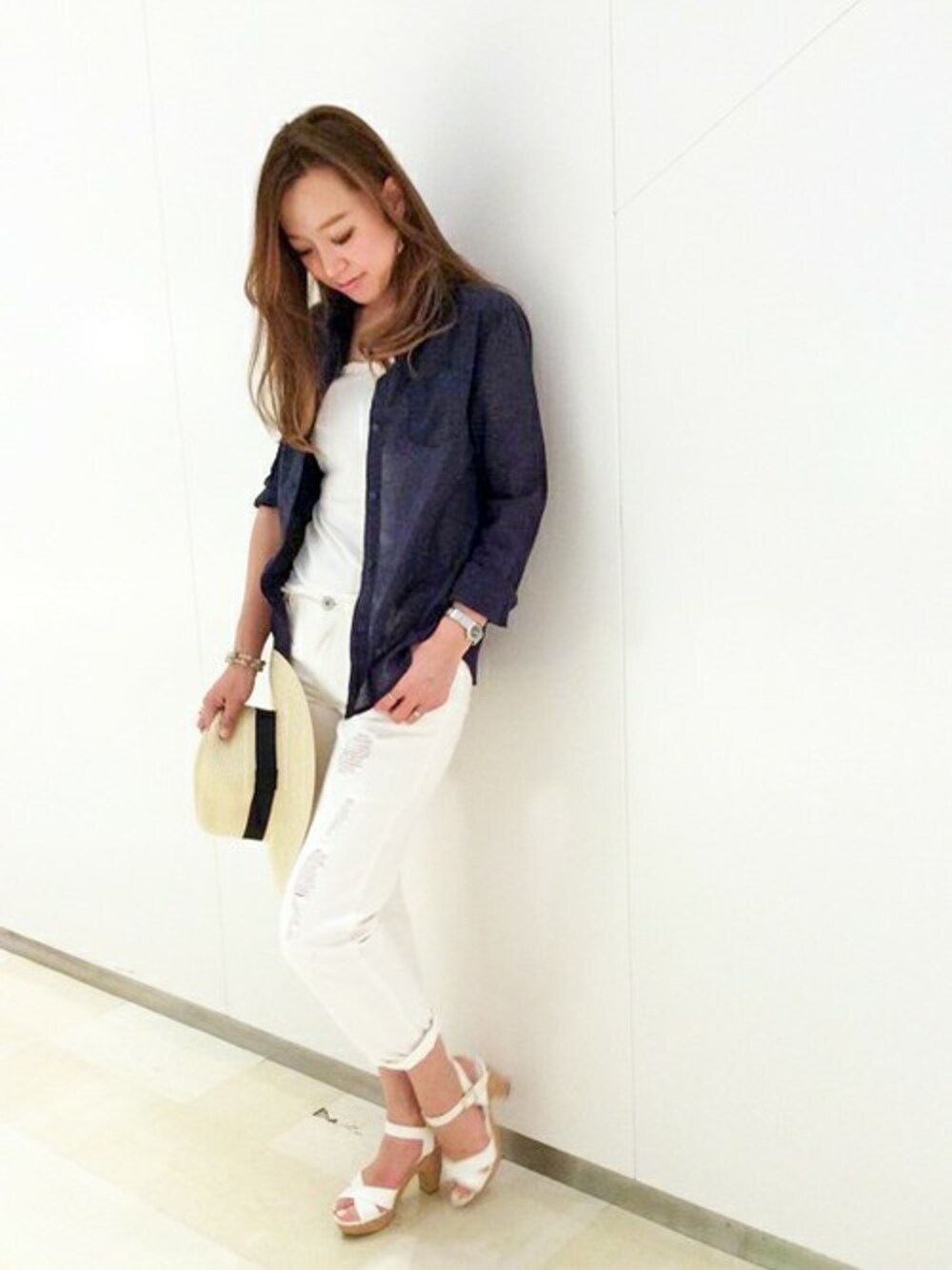 爽やかな『白×ネイビー』コーデです☆ 肌触りのいいガーゼシャツは、この時期の汗を吸収してくれたり、冷房対策にととっても優れもの(^O^) ホワイトデニムと合わせて落ち着いた雰囲気に・・・でも、このホワイトデニムですがダメージ加工してあり、かなりカジュアルなんですよ。 休日のリラックススタイルに◎