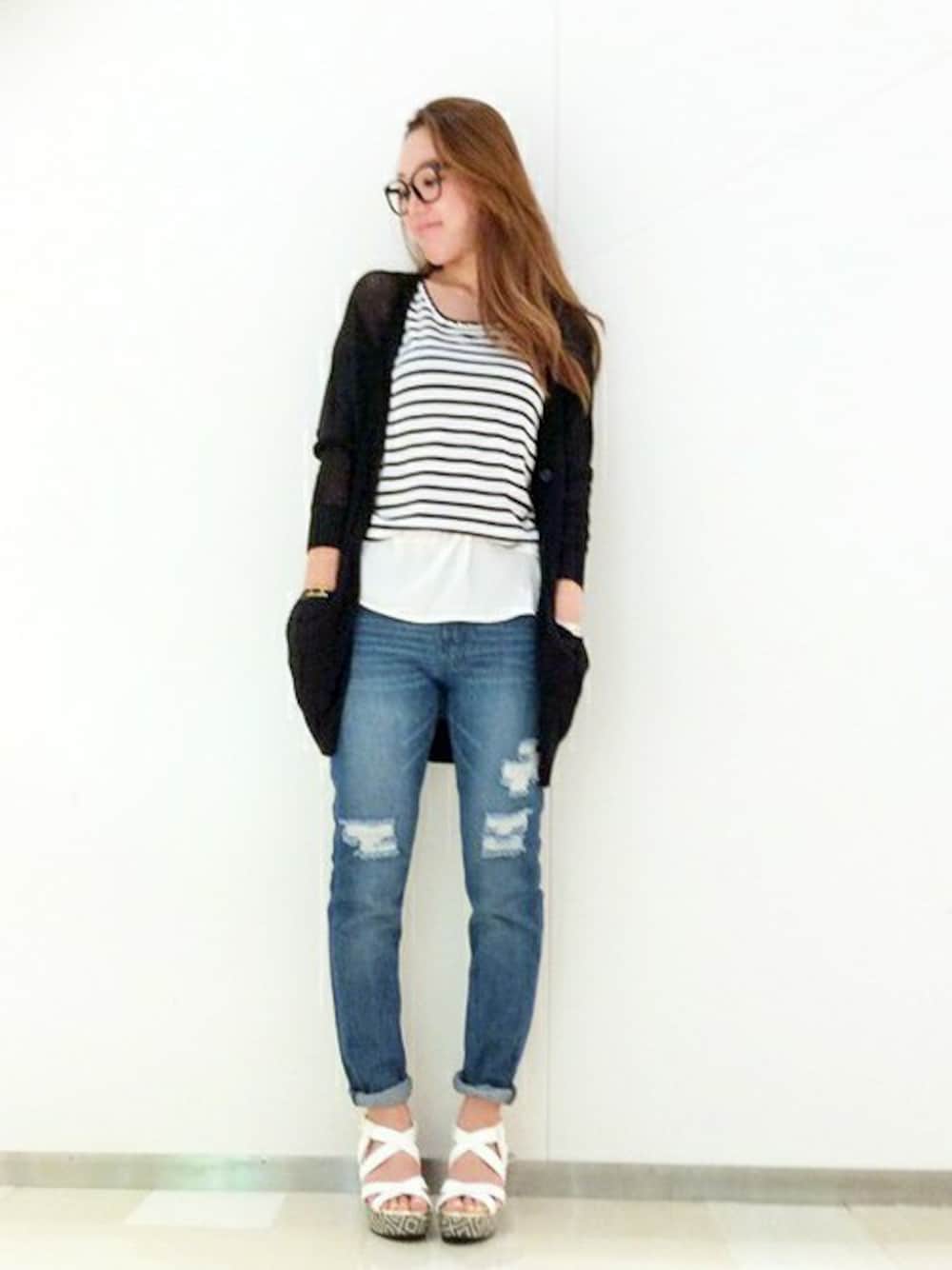 今の梅雨時期にちょうどいいメッシュのロングカーディガン着ました(´▽`*) ボーダーのタンクは白インナーとくっついていて、これ1枚で存在感十分!! オシャレに見えて、コーデ要らずって優秀ですよね(*´˘`*)♡ クラッシュデニムをロールアップして、ちょっとボーイッシュに(((o(*^∇^*)o)))