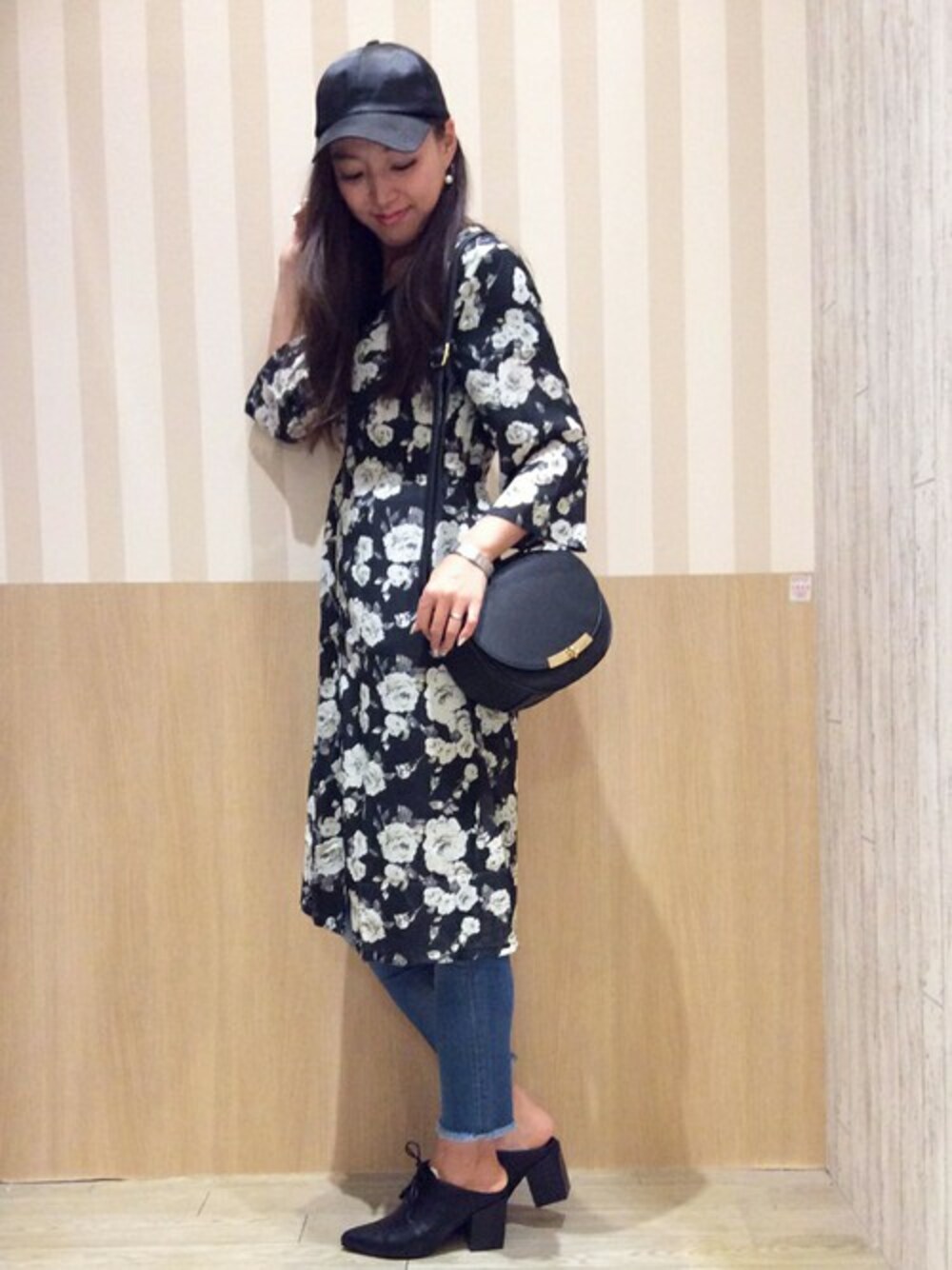 大人可愛い花柄ロングガウン♡ ウエストにゴムが入ったAラインのキレイなシルエットになってます.*゜ 小物を黒でまとめれば、落ち着いた大人の女性らしさがでますね(^^)