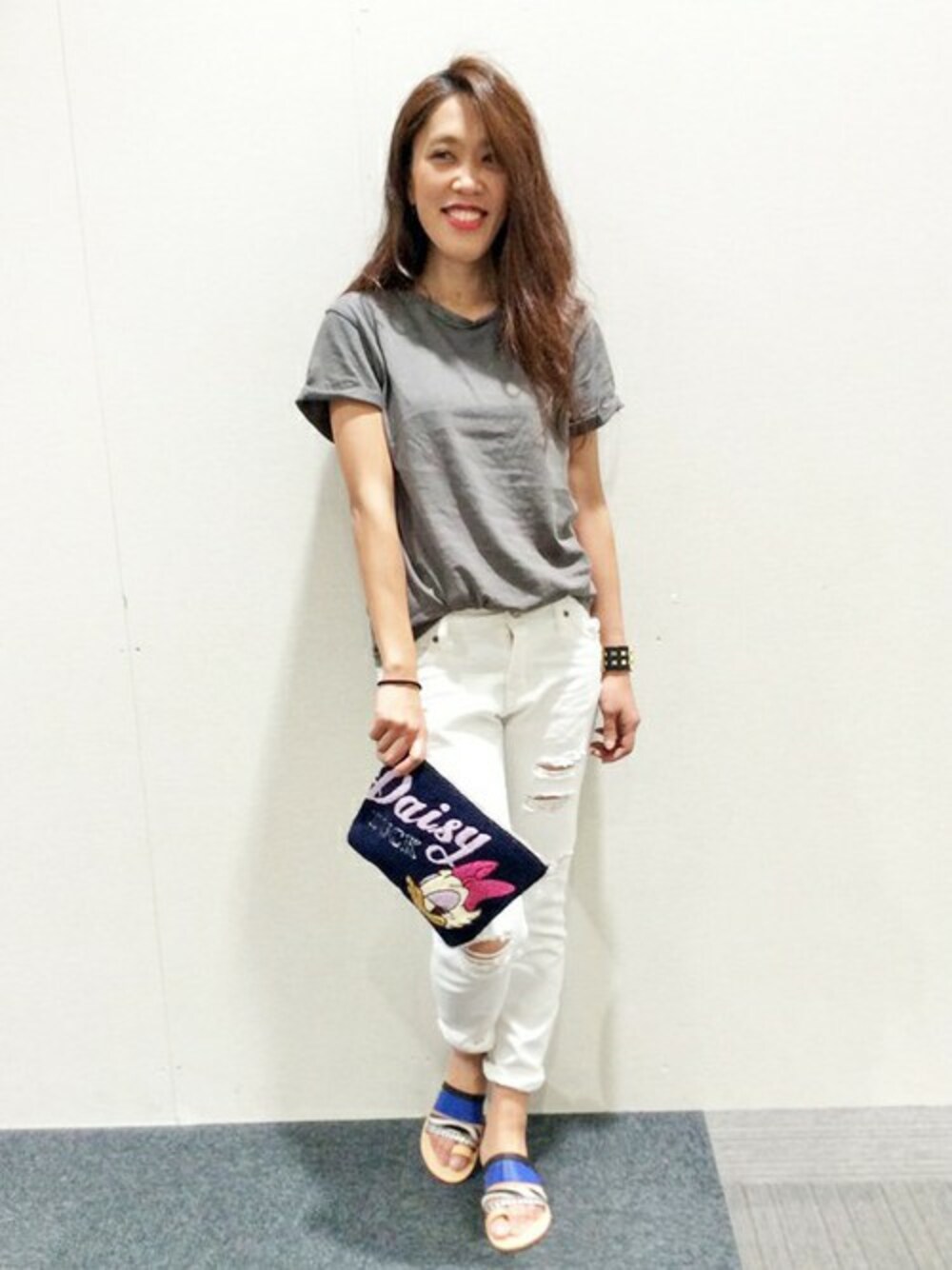 程よいダメージ加工でこなれ感たっぷりに仕上げたデニムパンツでスタイリング組みました!! ボーイズシルエットなので、ラフな大人っぽさを演出☆ メンズライクになりがちなダメージデニムはヒール合わせで女性らしいアイテムとのスタイリングがオススメ☆ ディズニーのクラッチポーチでちょっとそこまでコーデです♪