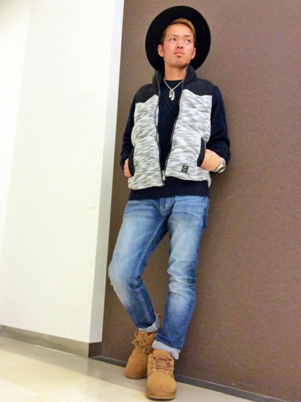 ryoumaのダウンベスト「スラブ切替中綿ベスト」を使ったコーディネート