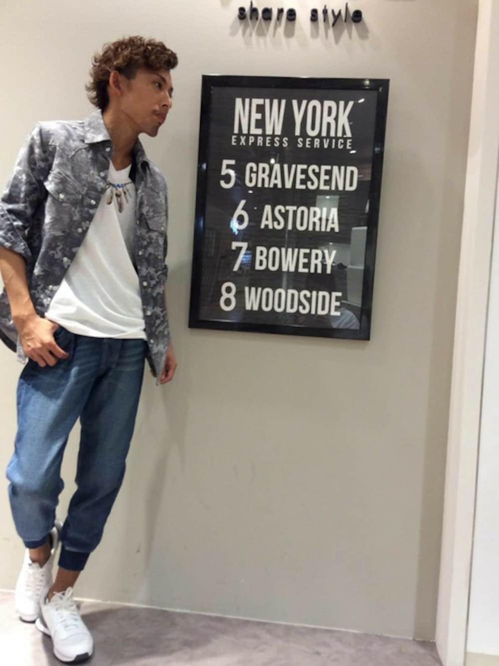 彩柄のシャツはシンプルなコーディネートに合わせて着るだけでGood!!(≧∇≦) タイトなシルエットなので、スマートにまとまります! インナーのネイティブ柄プリントがコーディネートを引き締めます!!(*^^*) 裾リブパンツと合わせ、カジュアルだけどトレンドをしっかり押さえました!