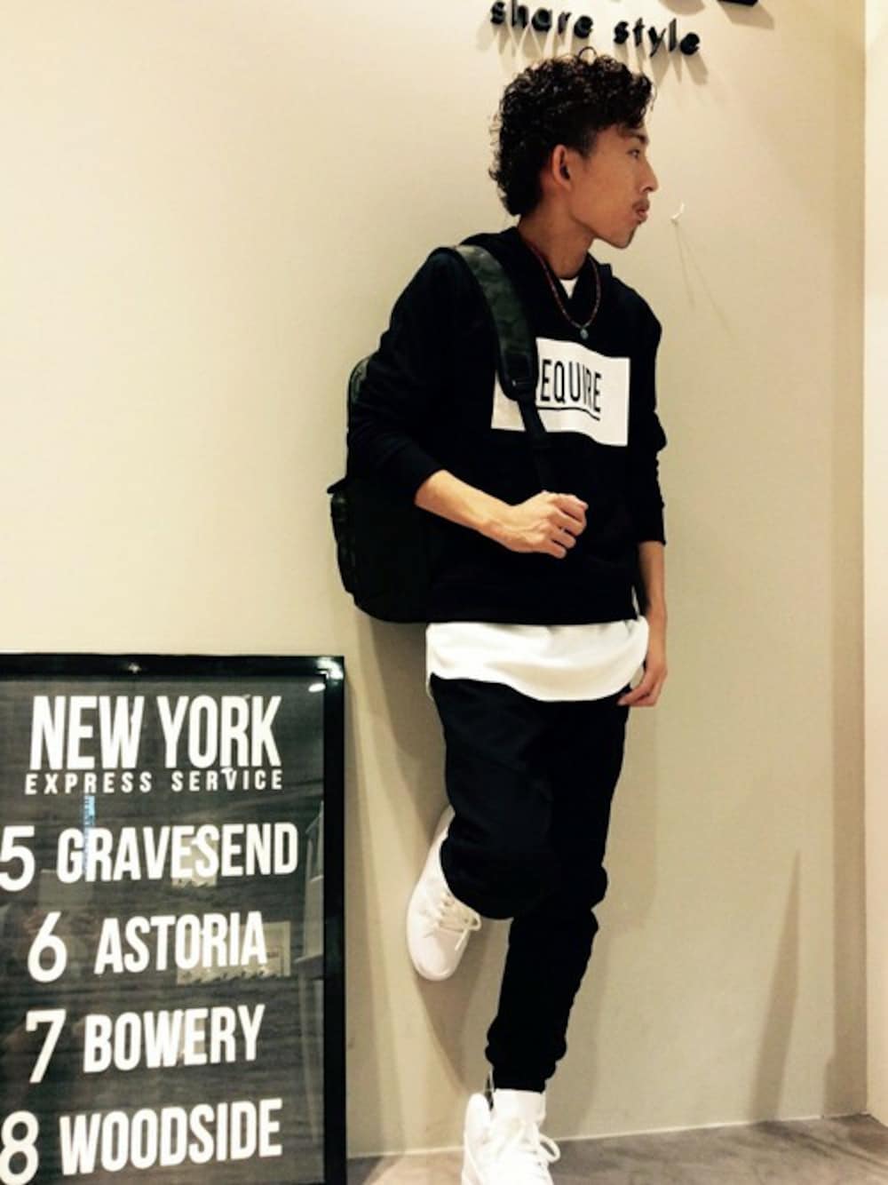 ストリートスタイル☆ モノトーンでまとめるとカッコイイですよね! パーカーはシンプルなデザインなので、ボトムを選びません。 迷彩柄のリュックがコーディネートを引き立てます!