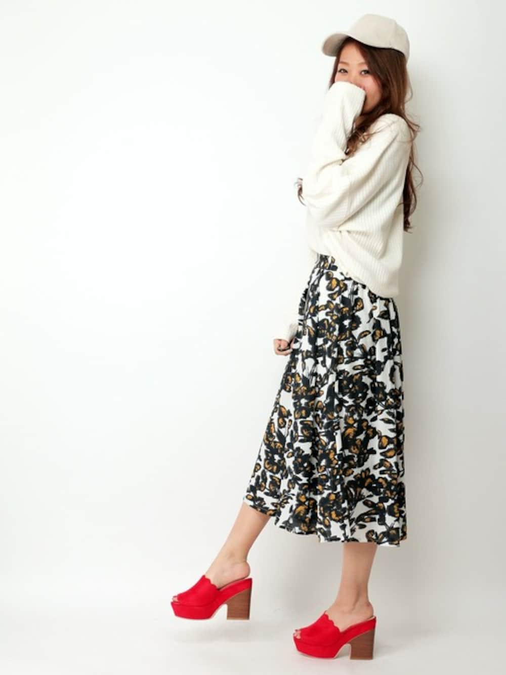 花柄スカンツの春コーデ.❀゜ キャップを合わせてボーイッシュに。 ゆるめなコーデですが、足元の赤が目を引きます。