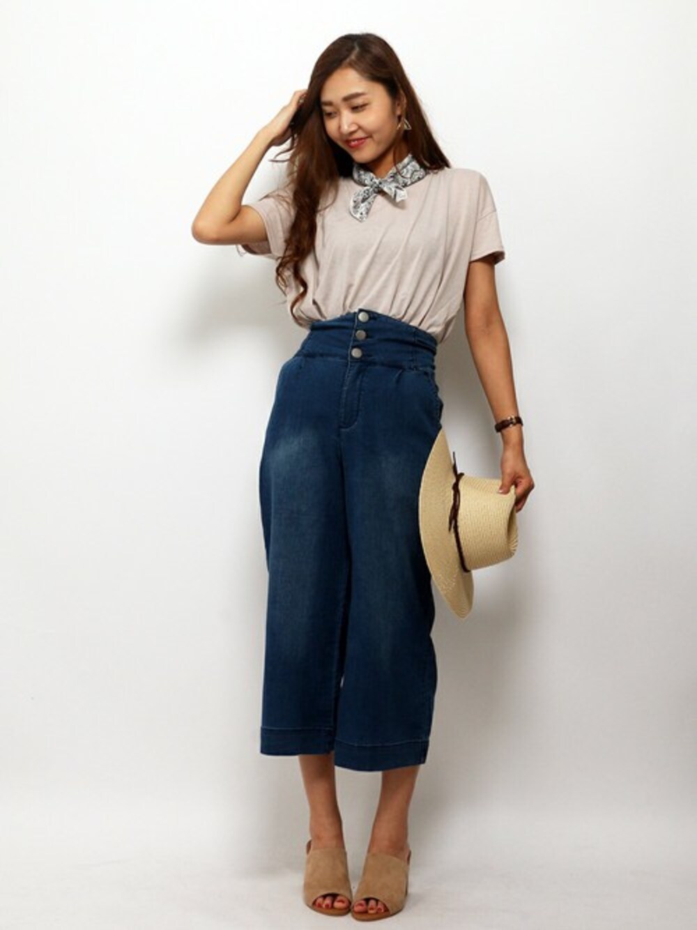 トレンドのバンダナコーディネート☆ 今年はアクセサリー感覚でバンダナを取り入れるのが流行中!! 落ち着きのあるピンクベージュで、大人カジュアルに…(*´∇`) 明るすぎない色味なので、秋まで使えちゃいます♡
