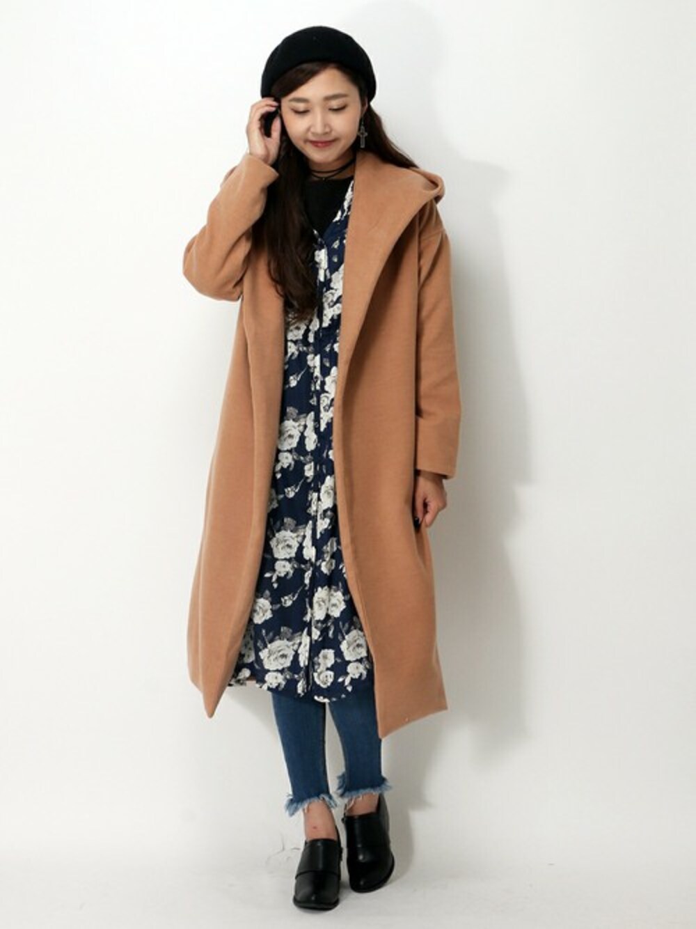 前を開けても着流しても女っぽいエレガントな風格を漂わせるガウンコート。 フードまで自然に繋がるワイドカラーは、上半身をコンパクトに見せさらに小顔効果にも期待できます♪ 大きめの花柄のワンピースをのぞかせて大人ガーリーに着こなしましょう♪