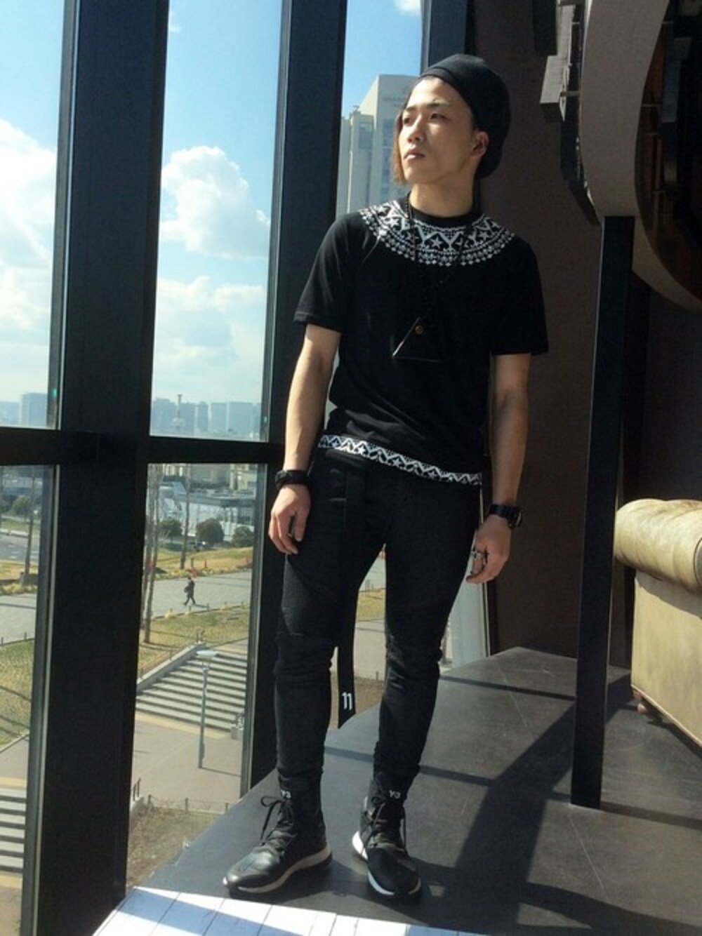 全アイテムを黒で統一したストリートスタイル。 トレンドのガチャベルトがポイント。