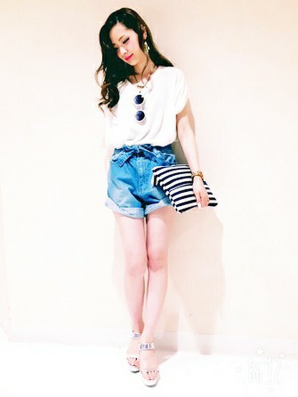 TOPSのドルマンは、接触冷感素材を使用で紫外線を80%以上カット!! 汗を素早く拡散させる特殊素材で、汗ばむ季節も快適に過ごせるのがうれしいアイテム☆ 可愛いだけじゃなく、機能性も抜群なのです!!! ショートパンツは着てみると、足が細く長く見えてびっくりしちゃいました(^◇^;) ボーダーのクラッチとマルサングラスで、夏っぽくコーディネートしてみました♬
