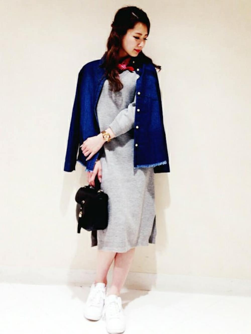 デコルテを綺麗に見せてくれるVネックや女性らしさのあるサイドスリットは大人っぽいデザインですよね(*´꒳`*) こんな風にスニーカーに合わせたり、首元にバンダナ巻いたりするとカジュアルにも着れます☆*.・(*ゝ∀・*)ノ 1枚でいろいろなコーデができるニットワンピは、優秀なアイテムで使い回しバツグンですよ☆