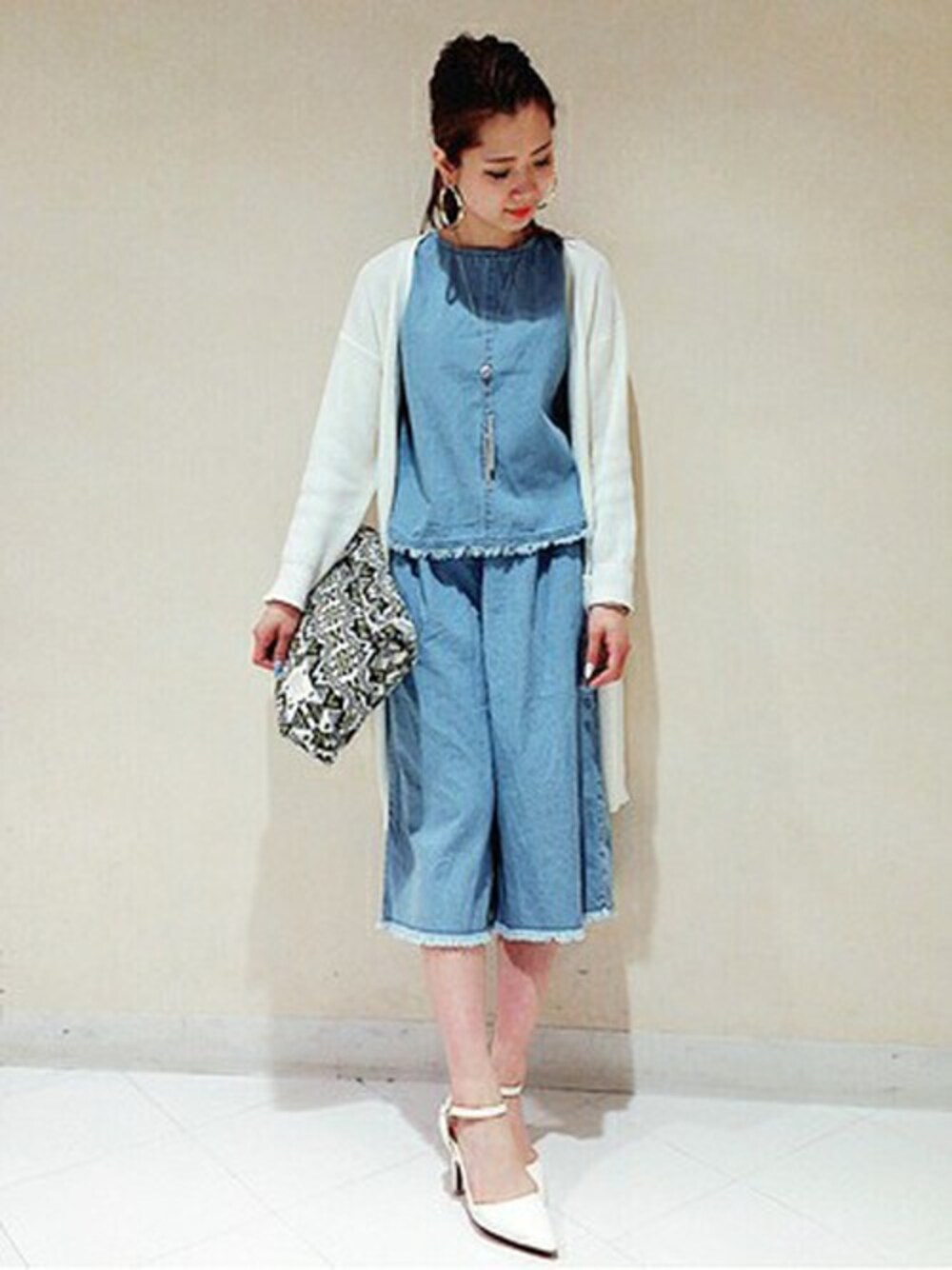 デニムのセットアップはなんだか新鮮ですよね♪ 裾フリンジが今年らしいトレンドの詰まった一品゚+。:.゚ヽ(*´∀`)ノ゚.:。+゚ ノースリーブなので春はロングカーディガンを羽織って 夏はそのままで、長く楽しめますよ♪