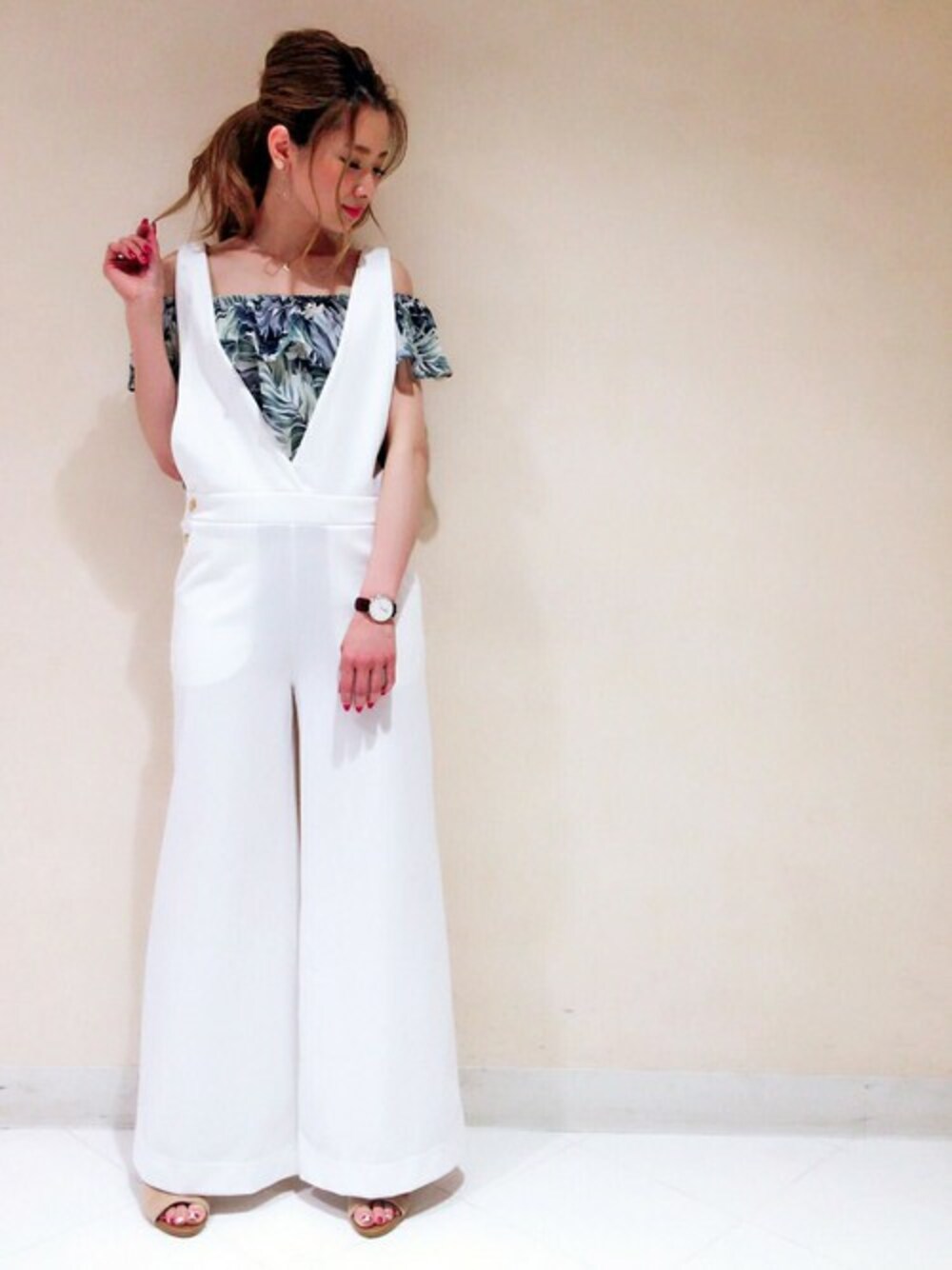 これからの夏にぴったりなコーデです☆♪ リゾート感あふれるオフショルにオールインワンで大人カジュアルに♪。.:* ワイドシルエットが大人の女性に仕上げてくれます・゚☆(●^▽^)゚☆.。.:*・゚