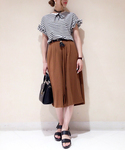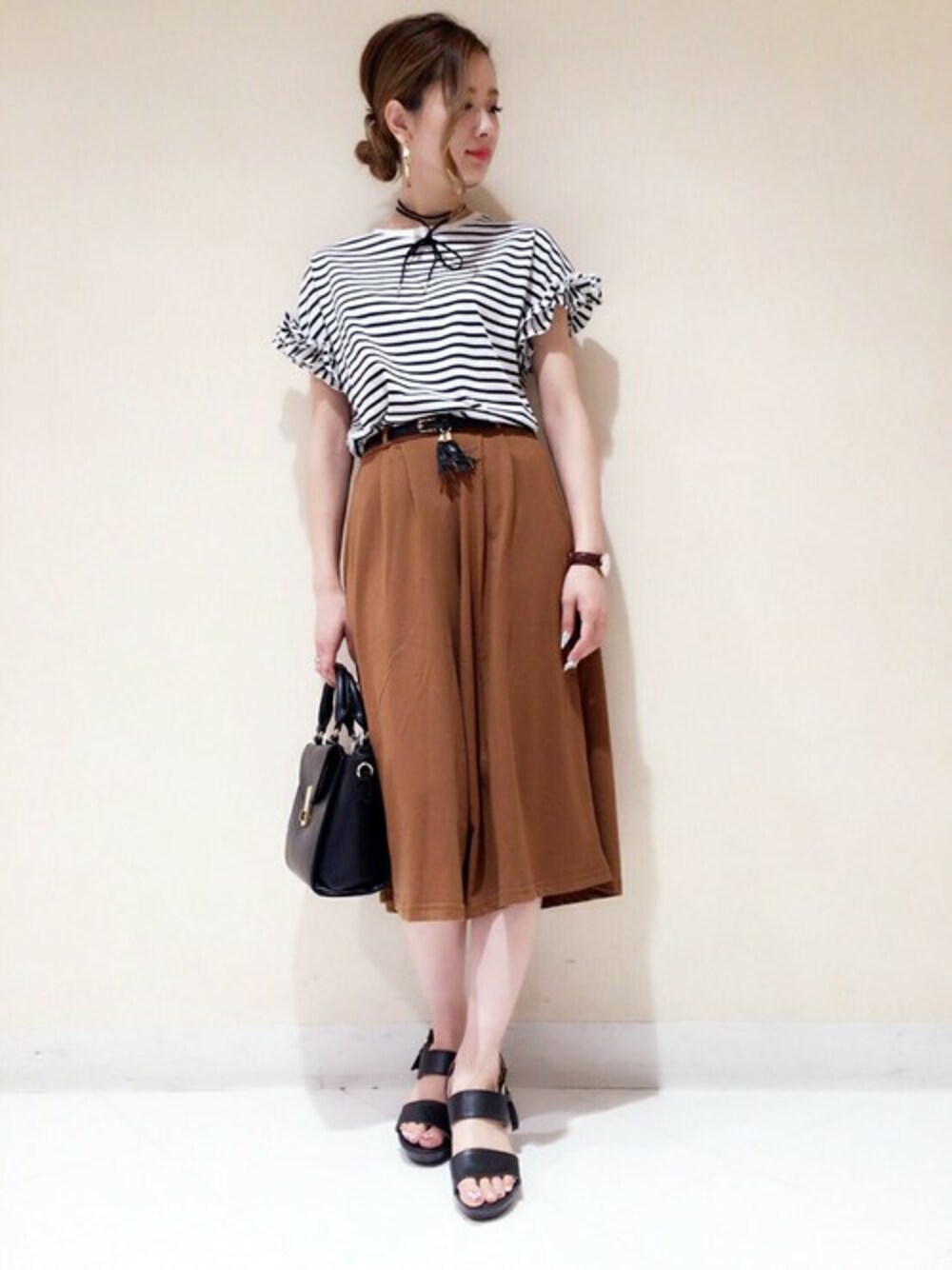 秋色ガウチョ、フェミニンスタイル♡ ブラックの割合を多くすることで更にAW意識しました(^-^) ロングチョーカー、ベルトとサンダルのタッセルの揺れアイテム トップスの袖フリルが女性らしい雰囲気を出します(。>v<。)♡
