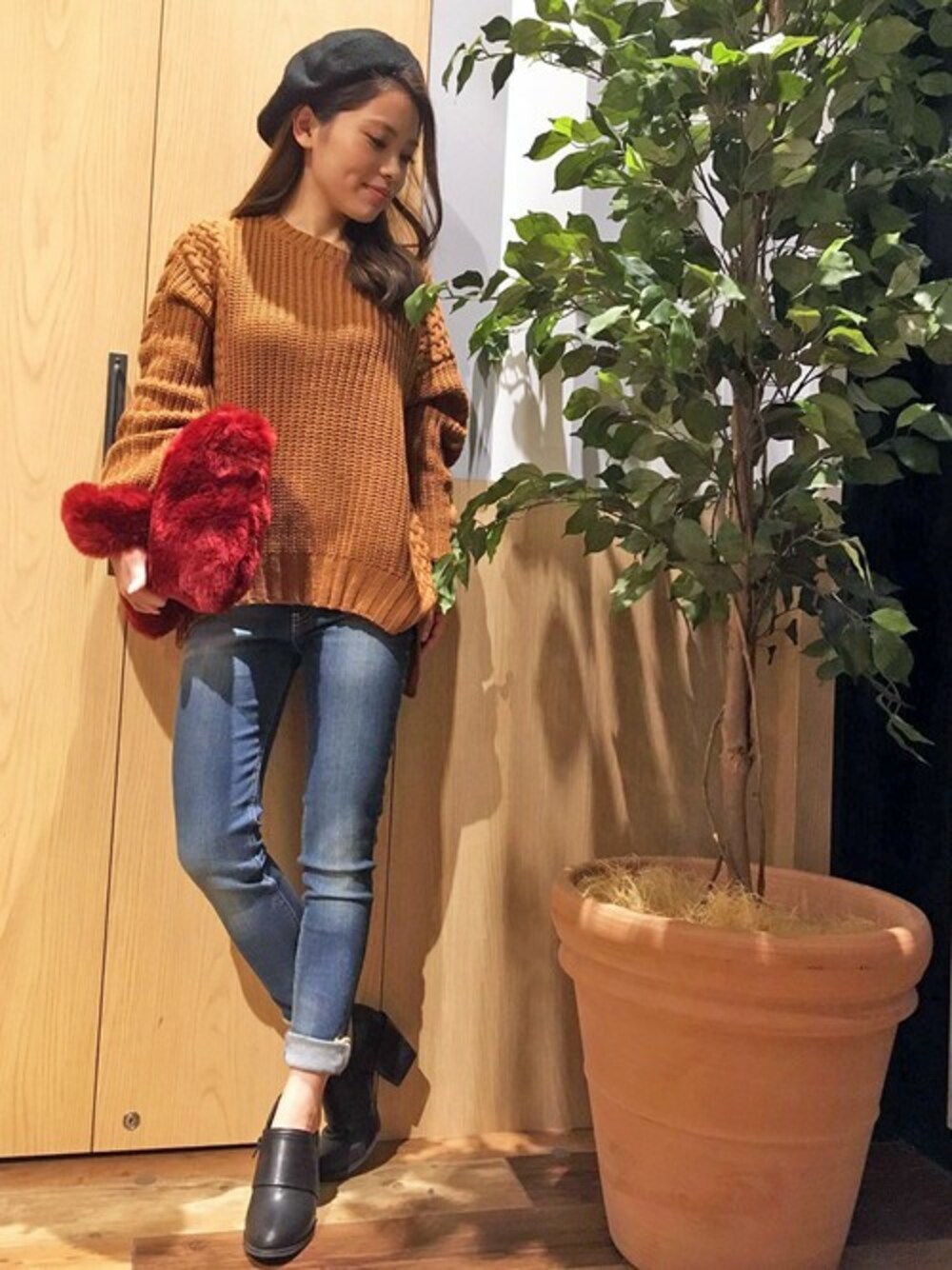 ストーンウォッシュデニムにブラウンのニットを合わせて♡ さまざまな編地をミックスしたニット。袖が少し長めでとても可愛いですよ♡