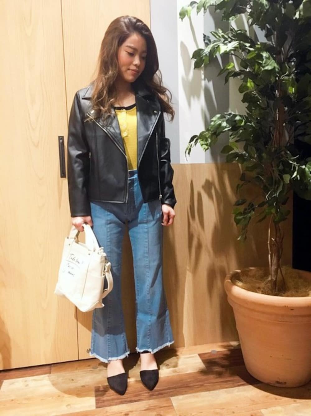 ライダースジャケットの 辛口コーデ♡♡ ライダースは羽織るだけで 大人コーデの完成! トレンドの ブラック×イエロー の組み合わせは モードな印象♡ イエローインナーは 1枚は持っておきたいですね☺♪