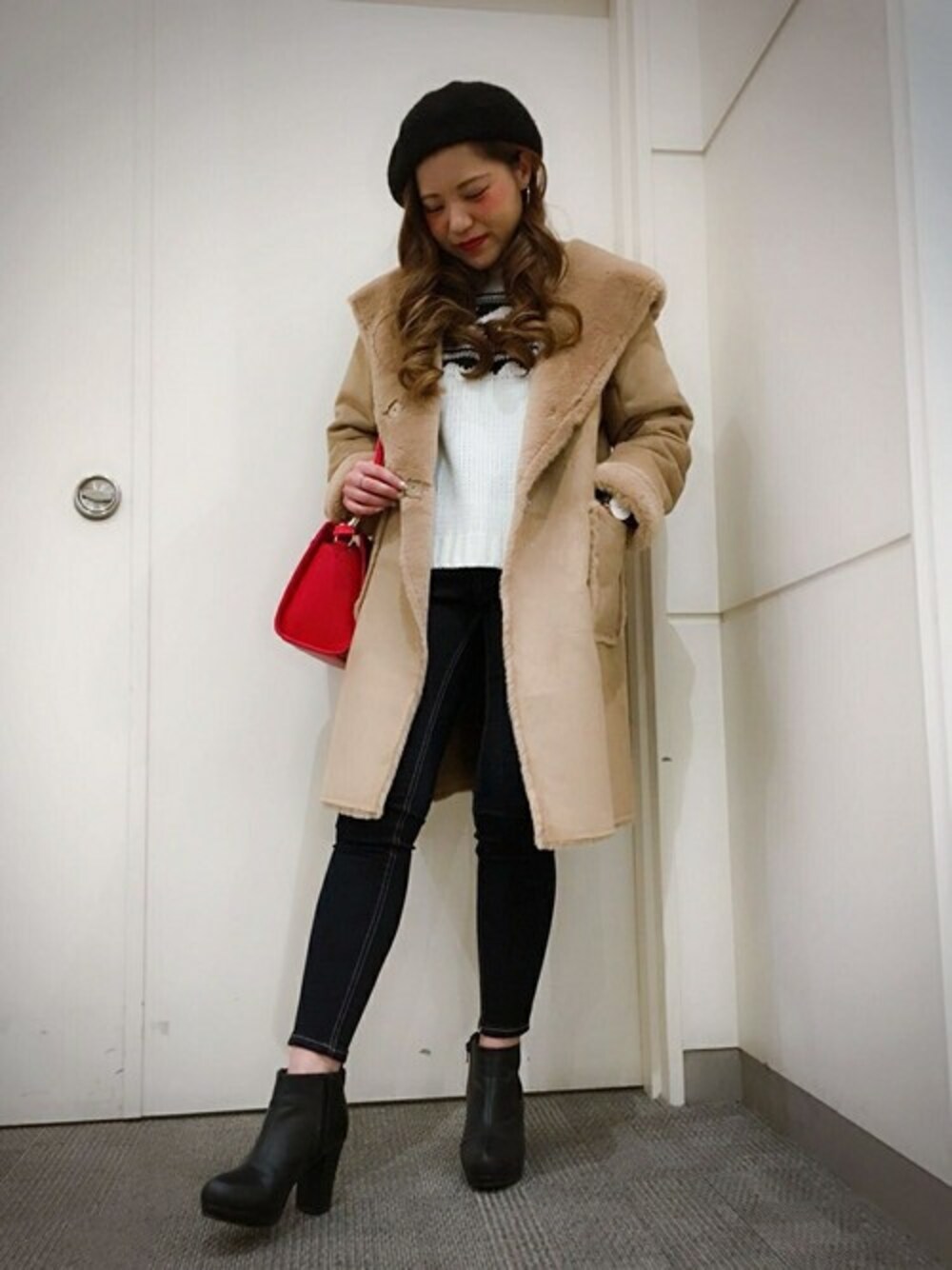 marinaのムートンコート「フェイクムートンフードコート 」を使ったコーディネート