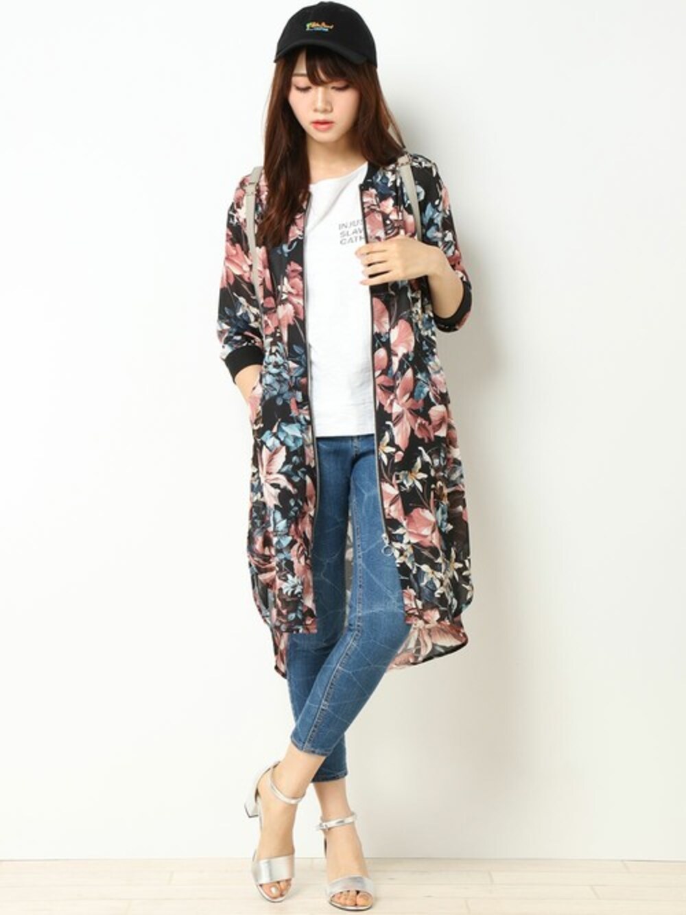 COX公式オンラインモデルのブルゾン「花柄ロングブルゾン」を使ったコーディネート