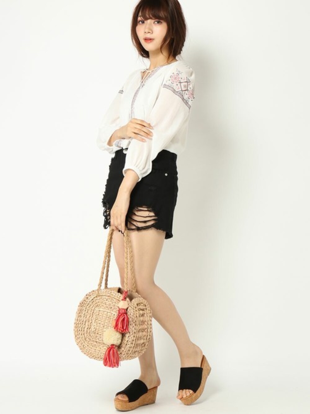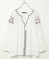 【JELLY出演モデル 田中芽衣着用】 クロスステッチ刺繍をあしらったボヘミアン調のシャツブラウス。 シャリ感のあるやわらかなコットンカーゼ素材はほんのり透け感があり、軽やかな印象を与えてくれます。 胸元とタッセル付きリボンがアクセント♪ コーディネートの主役になる、これからの季節にぴったりなおすすめアイテムです。