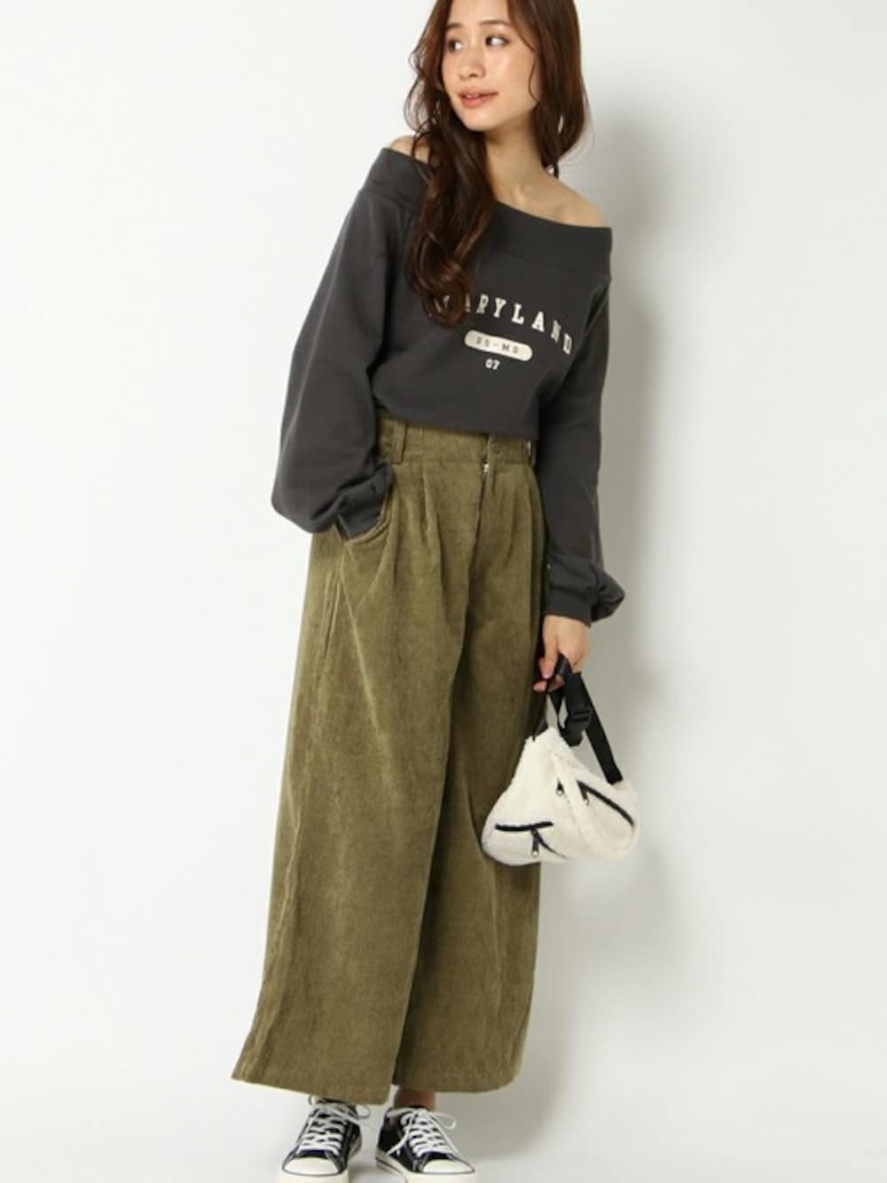 カジュアルが好き!でも女らしさもほしい! そんなアナタにぴったりの、オフショルタイプのロゴプルオーバー。 肌見せと萌え袖で、彼のハートも鷲掴みに♪ 今期大注目のコーデュロイパンツを合わせて、さらにこなれ感をUPさせて。