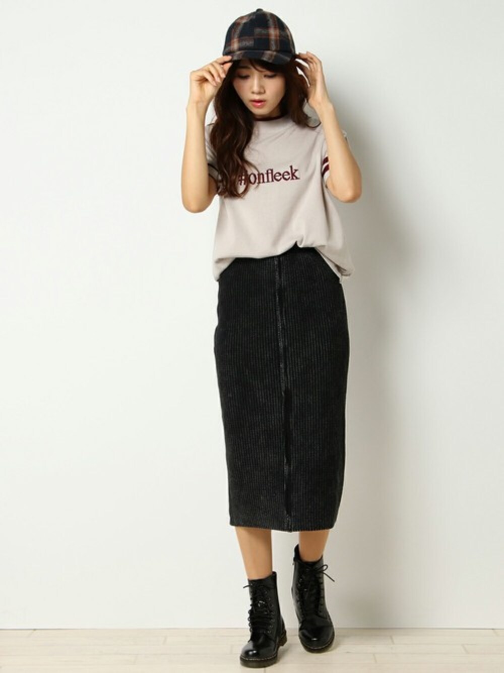 今年っぽいコーデにするならニットスカートがおすすめです! ロゴニットやチェックCAPでアメカジ風のちょうどいいカジュアル感が◎