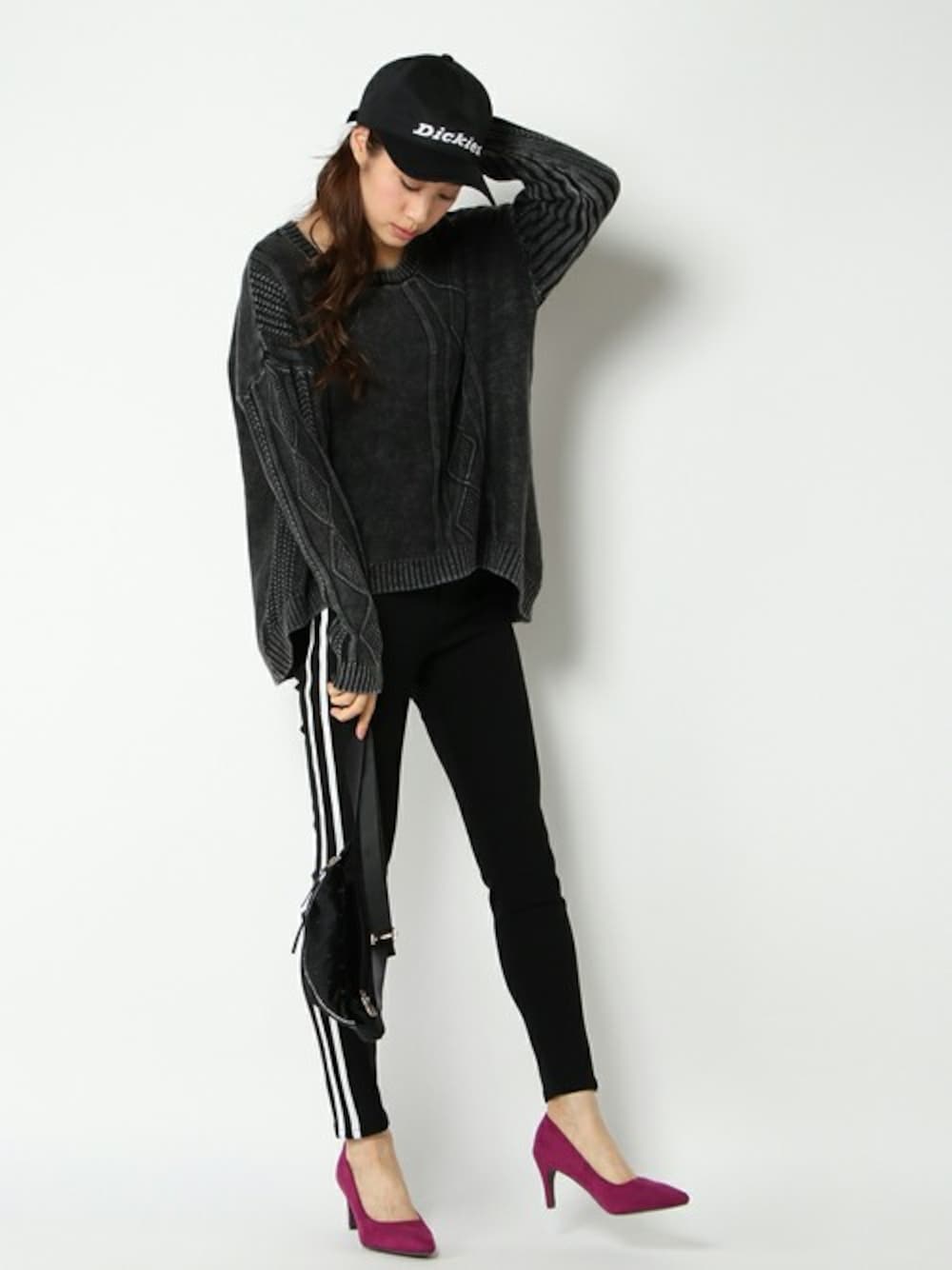 ヴィンテージ加工と、個性的なケーブル柄がおしゃれなニット♪ ワントーンコーデでまとめました! ニットは少しグレー味ががったお色合いなので、 ブラックでまとめても重くなりにくく、足元にポイントで色味を入れるだけで大人カジュアルに♪♪