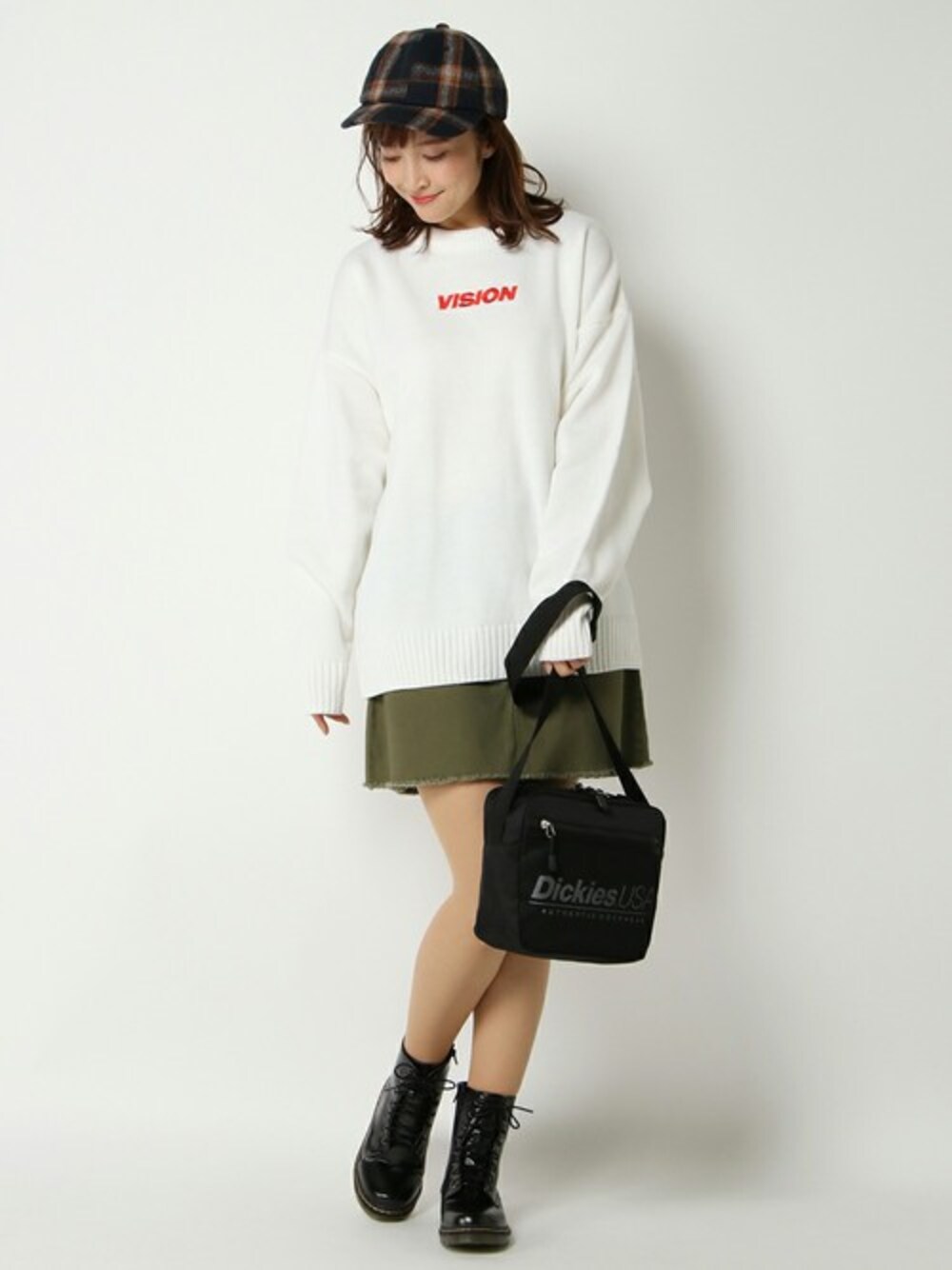 ワンポイント刺繍ロゴで、シンプルに着回せる肉厚ニット。 ブラックアイテムでかっこよさを残しつつ、 ミニスカートの肌見せで女子らしさをプラス。