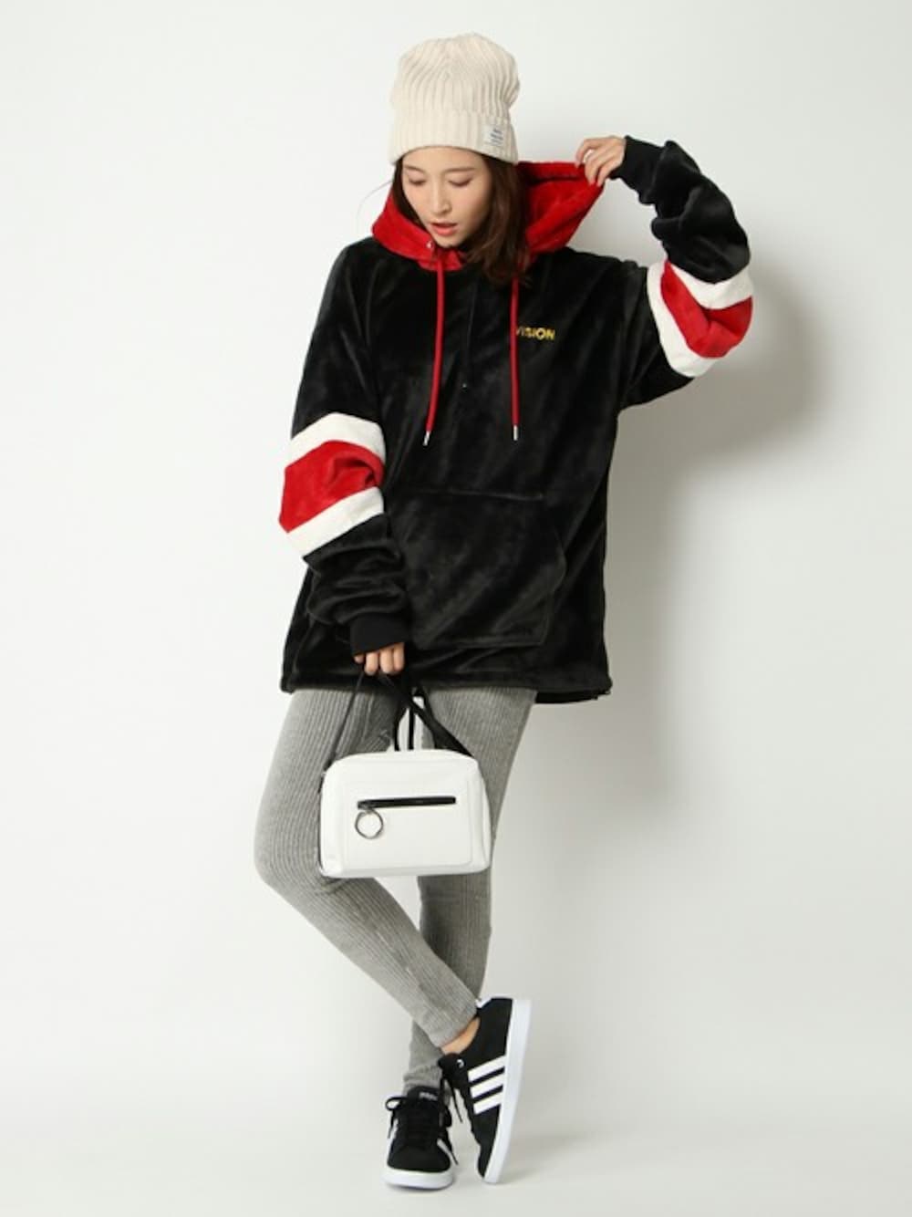 ストリートな表情と、あったか素材がたまらない!VISIONのハーフジップパーカー☆ レギンス合わせなら、Lサイズがオススメです! 女性が着ると、ルーズなシルエットと萌え袖が際立って◎