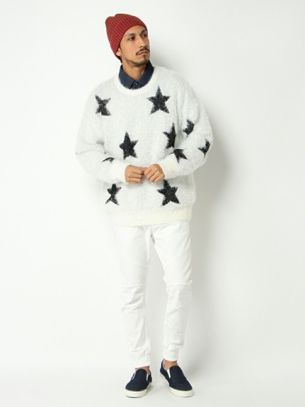 今年のニットスタイルの中でも特に注目度の高い、フェザーヤーンを使ったスター柄のニット。 ニットを1枚で着るよりもインナーにデニムシャツを忍ばせるだけで、お洒落度が格段にアップできます。