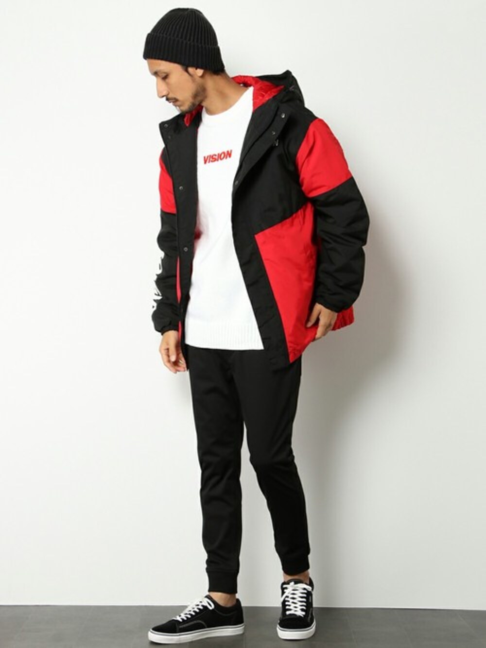 VISION STREET WEAR の中綿アウター。 大胆な配色の切り替えに、袖&フードのロゴでストリート感アップ! シンプルなモノトーンコーデに羽織るだけでサマになる優秀さも◎