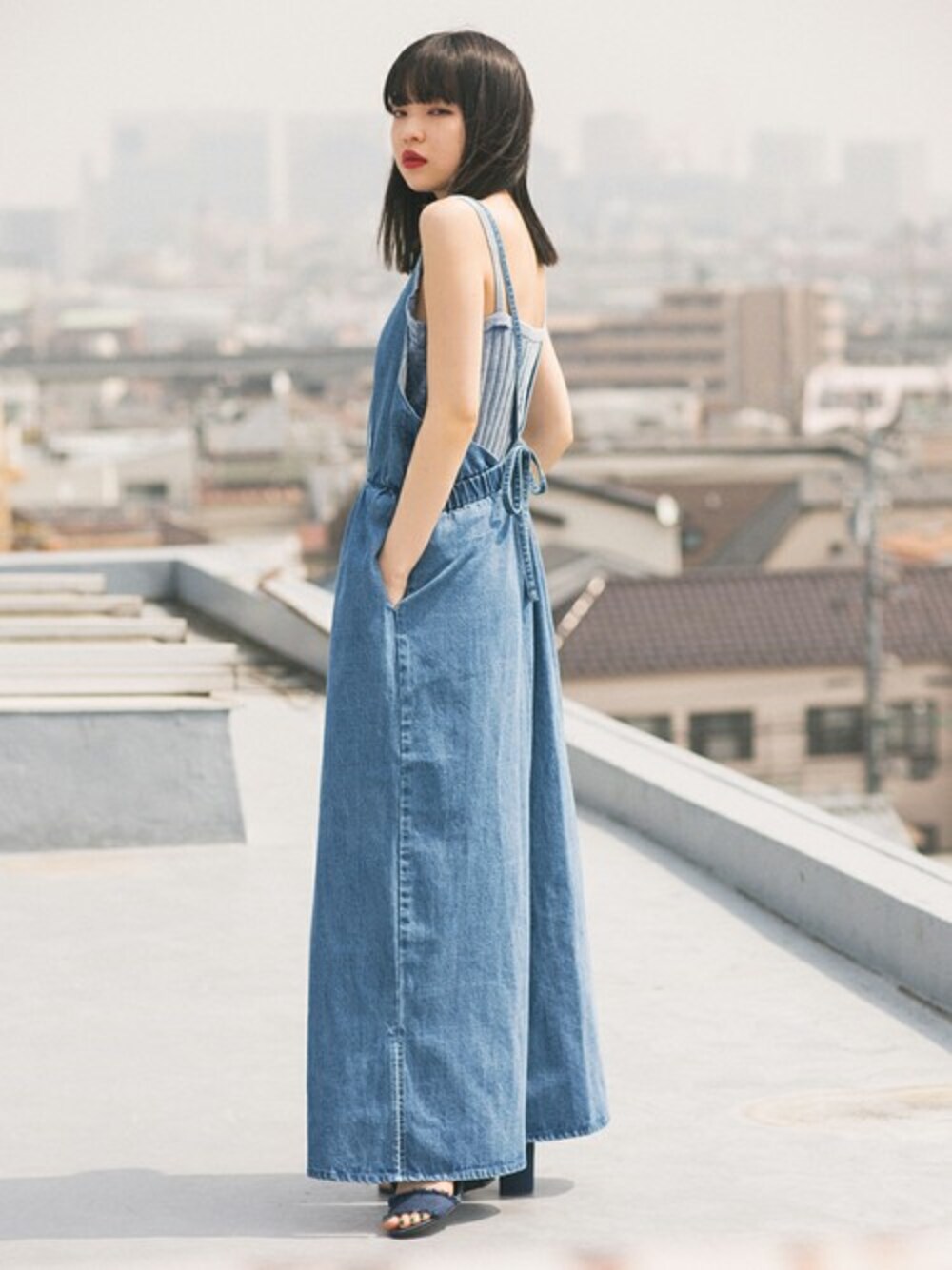 【JELLY出演モデル 田中芽衣着用(ブルー)】 たっぷり分量を取ったワイドフレアのデニムロンパース。 シンプルながらも、腰高に見える切り替えと、女性らしいカシュクールのフロントがポイント! ストラップは自分にジャストな長さに調整できます。