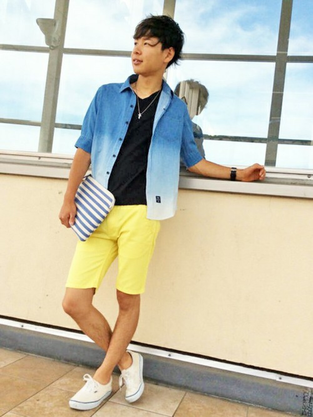 グラデーションシャツは毎年大人気で羽織るだけで爽やかコーデの完成です! インナーを変えることによって印象も変わってくるのでいろんなコーデを楽しめますよ◊◊(^^)◊◊ ツイルのショートパンツ&ボーダークラッチで夏コーデ楽しんでください≧(´▽`)≦