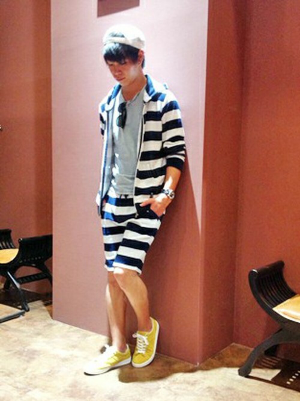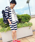 夏気分全開なボーダー柄セットアップ。 インパクトのあるアイテムなのでシンプルなTシャツを差し込んでバランスを調整。 足元には軽快なカラーリングのスニーカーで遊び心を。