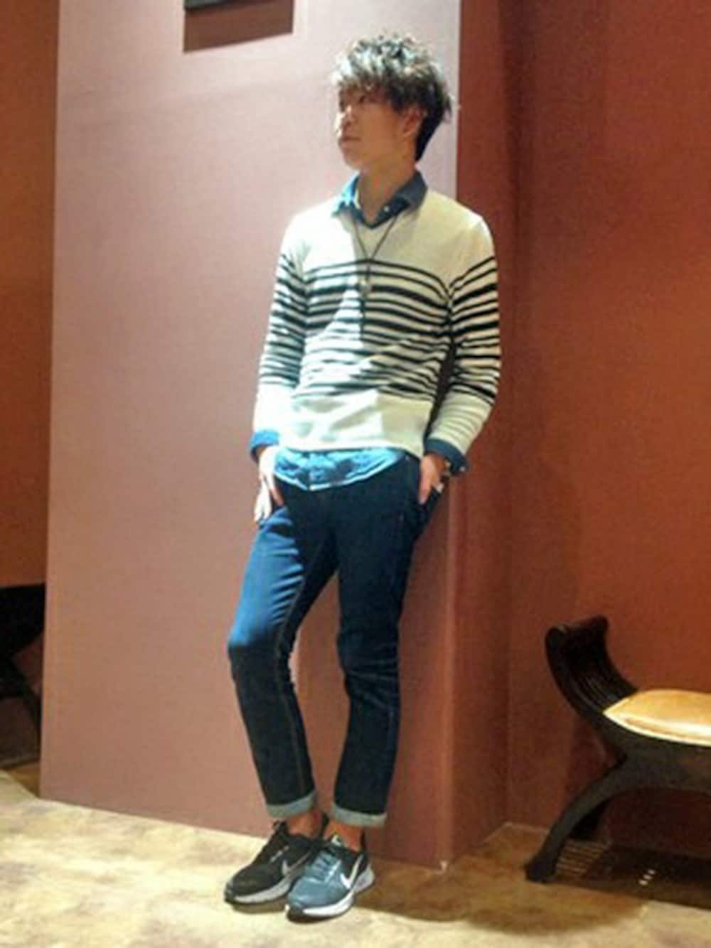 今日のコーデは今年らしいデニムシャツのニットイン\(^o^)/ Vネックのニットで首元をスタイリッシュに☆ 暗めなコーデになりそうな時期ですが、ボーダーニット着用で明るい感じになりますよ( ^ω^ )