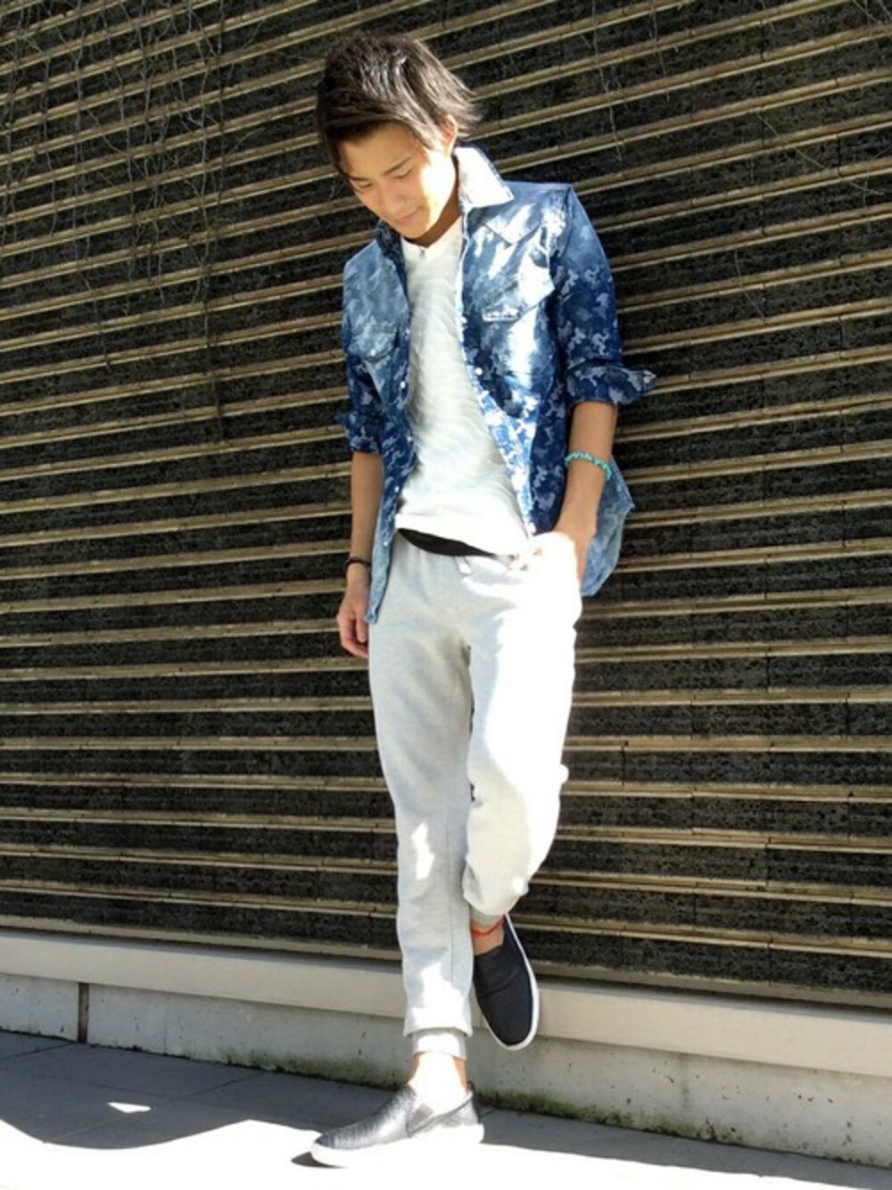 ジョガーパンツコーデ(^-^) スウェット地のボトムは、トップス次第でカッコよくまとまります! 今回はレイヤードスタイルに合わせてみました! 青のシャツとグレーの組み合わせがオシャレですよね☺