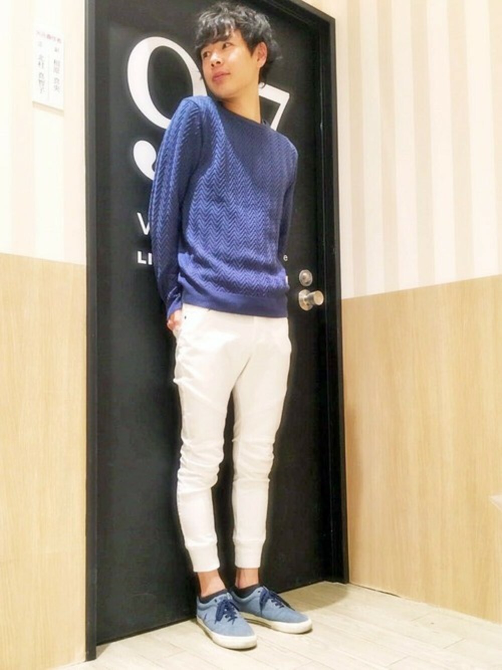 シェブロン柄と呼ばれるジグザグ模様の編地で、一枚でもしっかり洒落感の増すニットプルオーバー。 コットン×アクリルの軽くてソフトな素材感は、今から春までロングスパンで大活躍! パンツは白を合わせて、爽やかな印象に仕上げました★