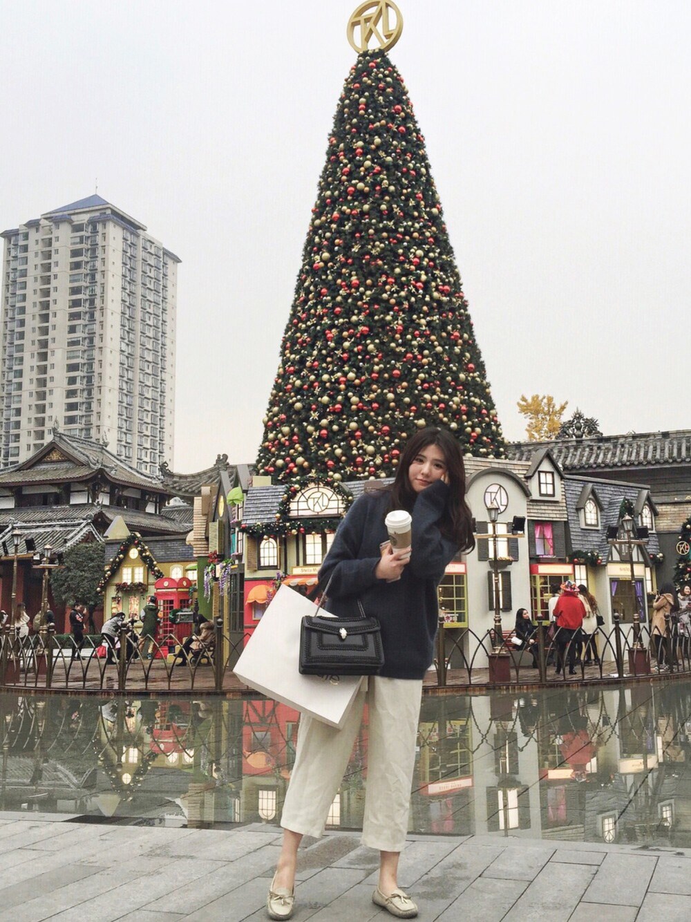 ブラック系のトートバッグを着用したレディースの冬コーディネートの1枚目の写真