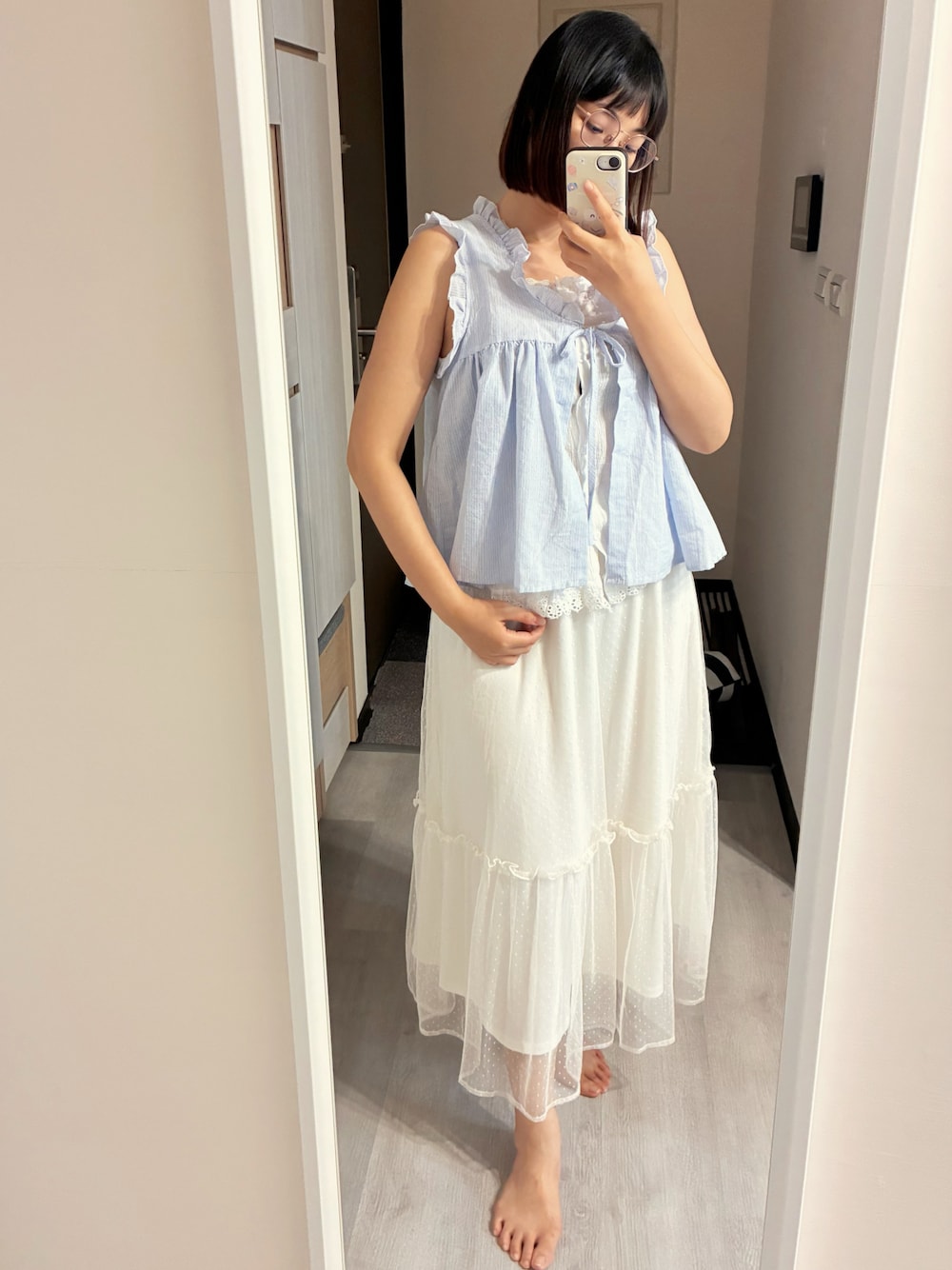 在台南市集服飾攤一見鍾情的兩件式背心 整件是棉麻材質,白色內裡風格充滿鄉村風,藍色背心有超級可愛且修飾手臂的荷葉邊,顏色上更是符合夏天,穿無袖也比短袖更舒適,比較台灣真的好熱呀! - 新購入的紗紗x圓點蛋糕裙 份量感重,內裡和外紗縫在一起 圓點點是裙子的小亮點 帶動紗紗的活潑感,是很百搭的單品
