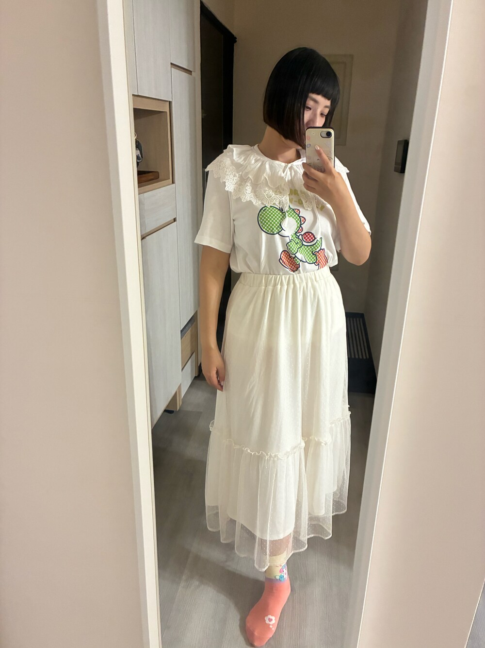 耀西t恤在uniqlo 買的,很可愛超喜歡 衣服親膚柔軟 下身搭配蛋糕紗長裙 裝飾領也帶有紗,和長裙搭配起來較一致