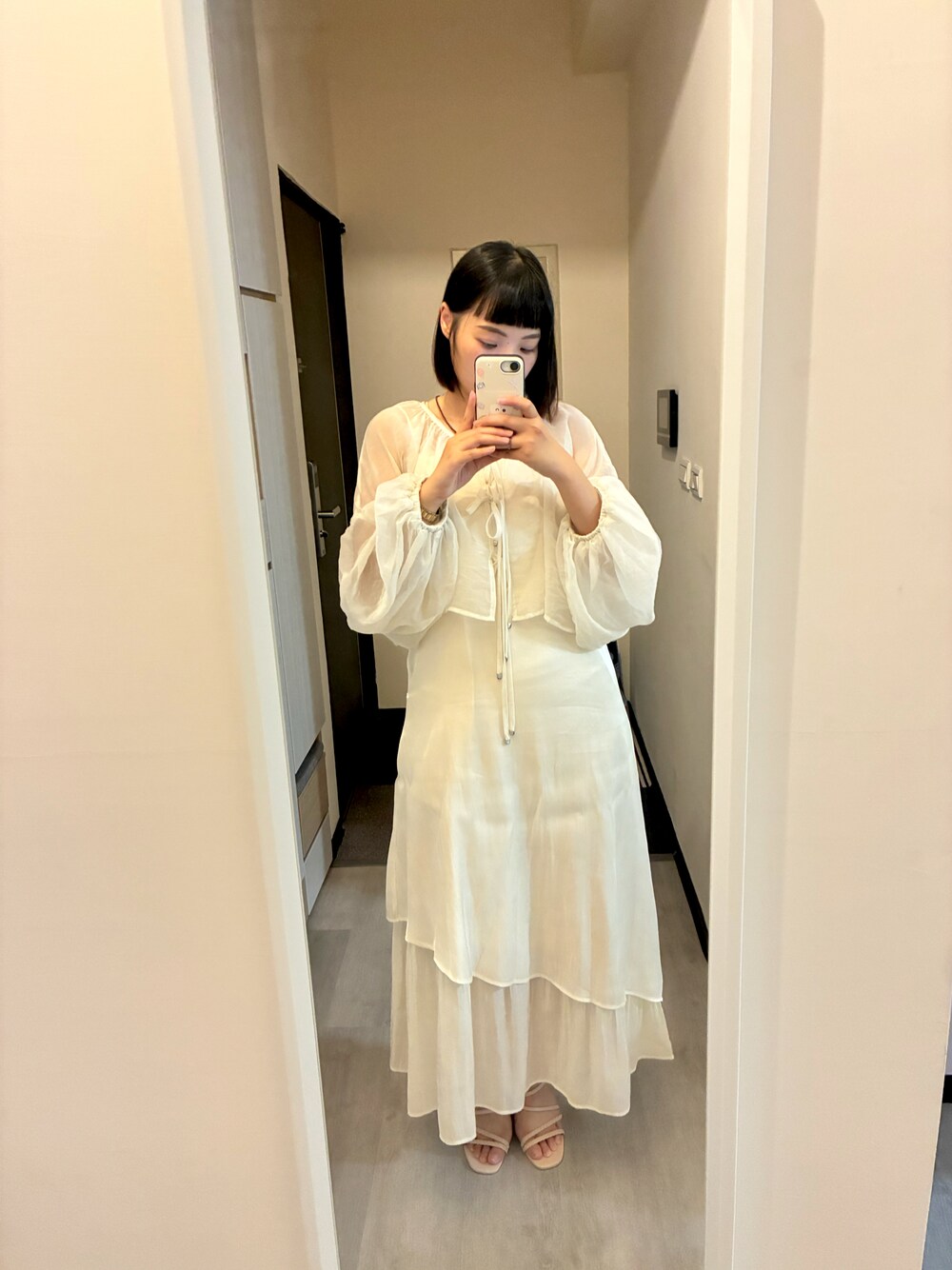 首先謝謝大家觀看 參加聚會又想不費力好好打扮的方法是! 波光粼粼的洋裝x透膚雪紡罩衫 - 溫暖米杏色加上服裝材質,在人群中有著溫柔亮眼的存在卻不刻意搶眼 洋裝長度及膝顯腰身,裙擺兩層設計不無聊 不想露出肌膚可以選擇罩衫 搭配思夢樂高跟涼鞋拉高身材比例