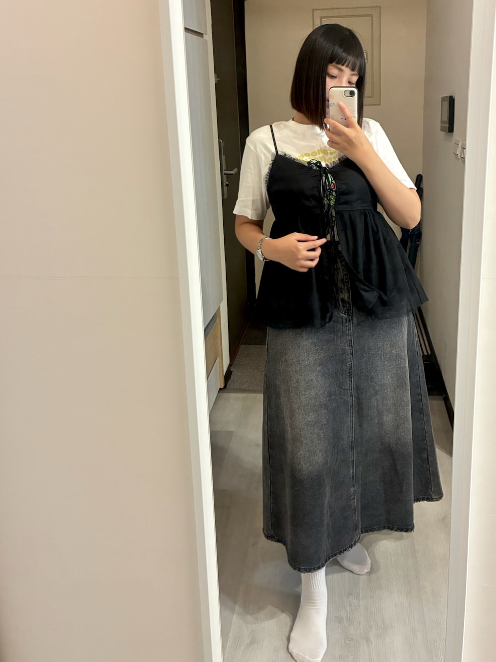 首先謝謝大家觀看 最近有點回溫要穿短袖,但因為不太會熱到流汗所以適合多層次穿搭 - 上衣:uniqlo 與瑪利歐的聯名,購入耀西圖案的t恤,非常可愛 黑細肩網紗背心:設計感很棒,網紗帶出酷甜感,很好搭配各種風格的衣服 A字牛仔裙:水洗感有點復古剛好符合最近的Y2K,搭配深色系上著更能凸顯水洗特色