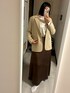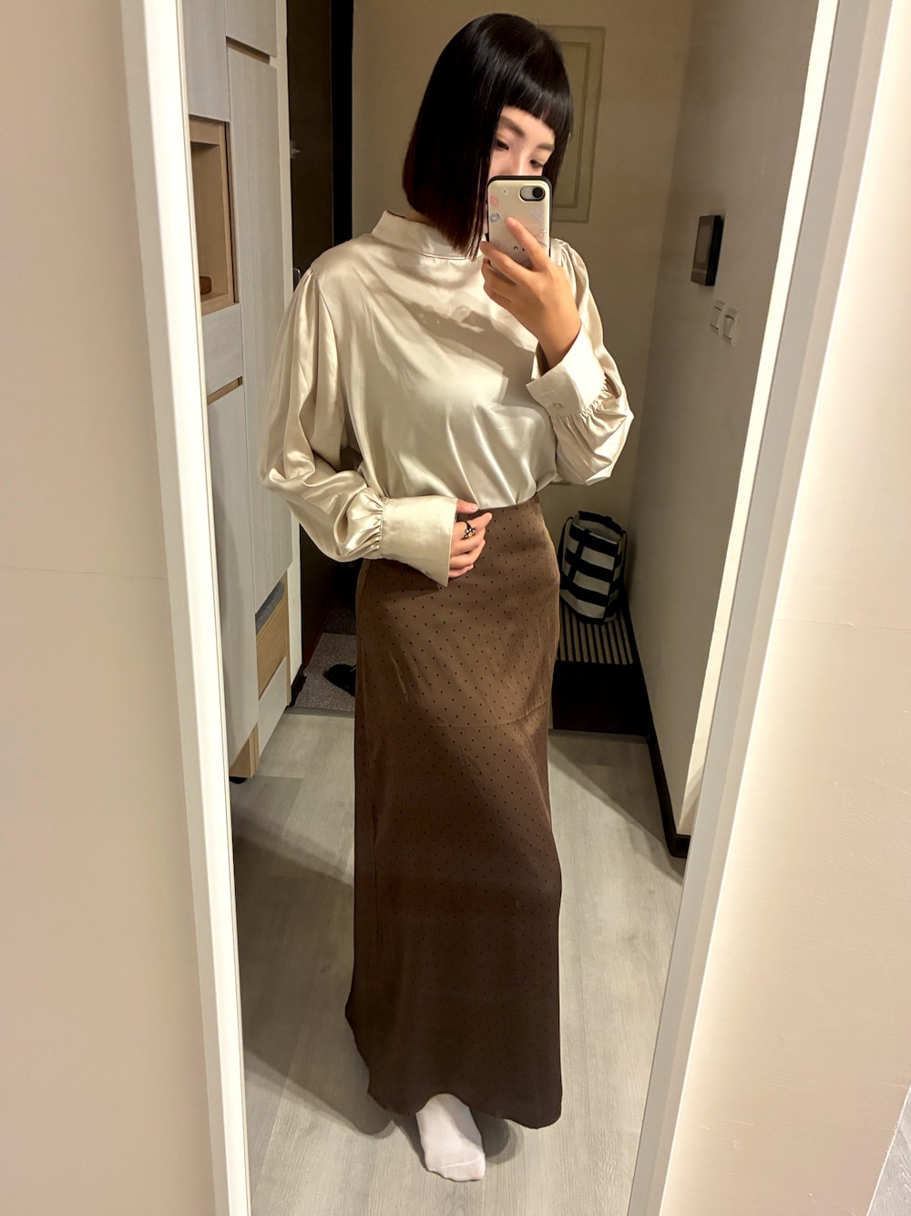 首先感謝大家觀看 - 襯衫:半高領香檳金緞面澎袖上衣,絲滑材質提升整體氣質,也因為是杏色系列很好搭配 - 咖色長裙:近看有黑色圓點,材質偏霧感,一樣是緞面布料,微魚尾設計,穿上十分修身 - 卡其西外:厚度及長度適中,可以很好的修飾骨盆及令人在意的小腹,卡其色系在秋冬季節能有突出的表現喔