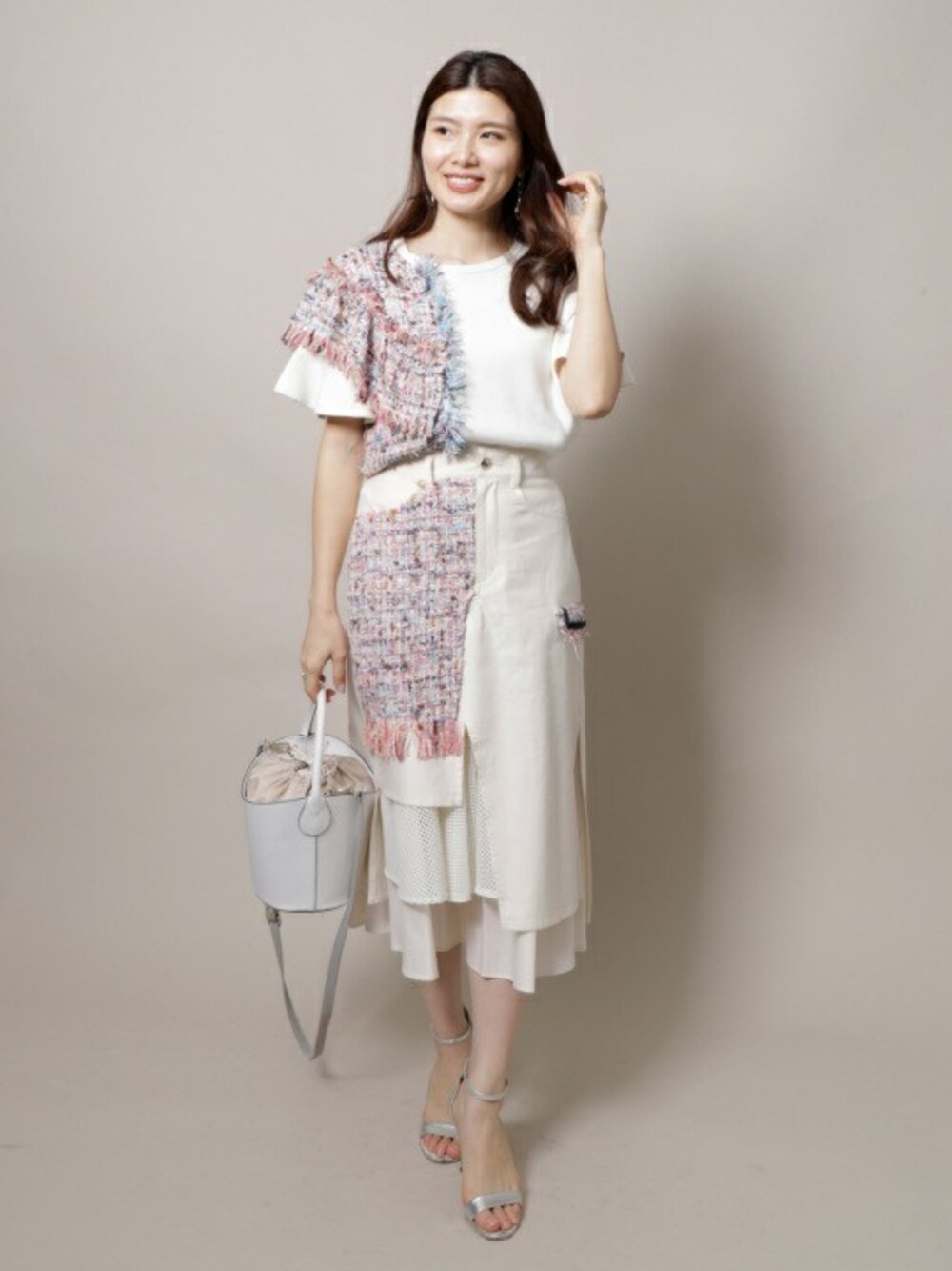 ヴェロフォンナらしさ溢れる春コーデ。 トゥルニエツイードが目を惹くセットアップ。 アシンメトリーなデザインが今年っぽい。 ホワイトよアイボリーのワントーンで 上品さとフェミニンなコーデに。 上下別々で着ても スタイリング映えするアイテム間違いなし。