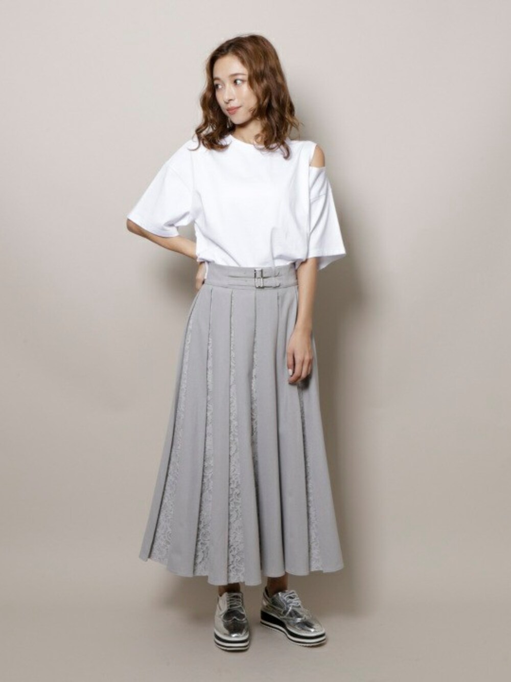 キレイなイメージのレースプリーツスカートに カットソーを合わせてカジュアルスタイルの完成。 ゆったりとしたトップスですが 肌見せで女性らしさもあり、大人カジュアルなスタイリングに。 足元もシルバーのメタリックな質感を取り入れて洗練された印象になります。