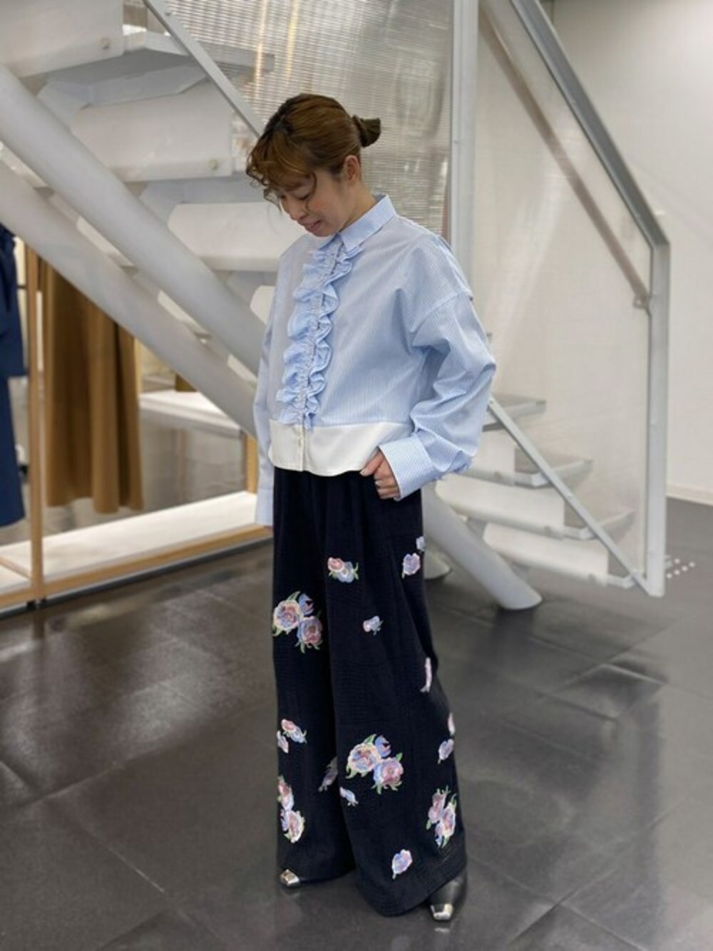爽やかなブルーが春らしいコーデ。 胸元にフリルを施したストライプのブラウスがヴェロフォンナらしいデザインで 顔周りはパッと明るくなります。 ボトムスはヴェロフォンナのオリジナルのフラワー柄を刺繍したクロシェパンツ。 履き心地も抜群で存在感のあるデザイン。 刺繍にブルーが入っているのでトップスとの色合わせも◎