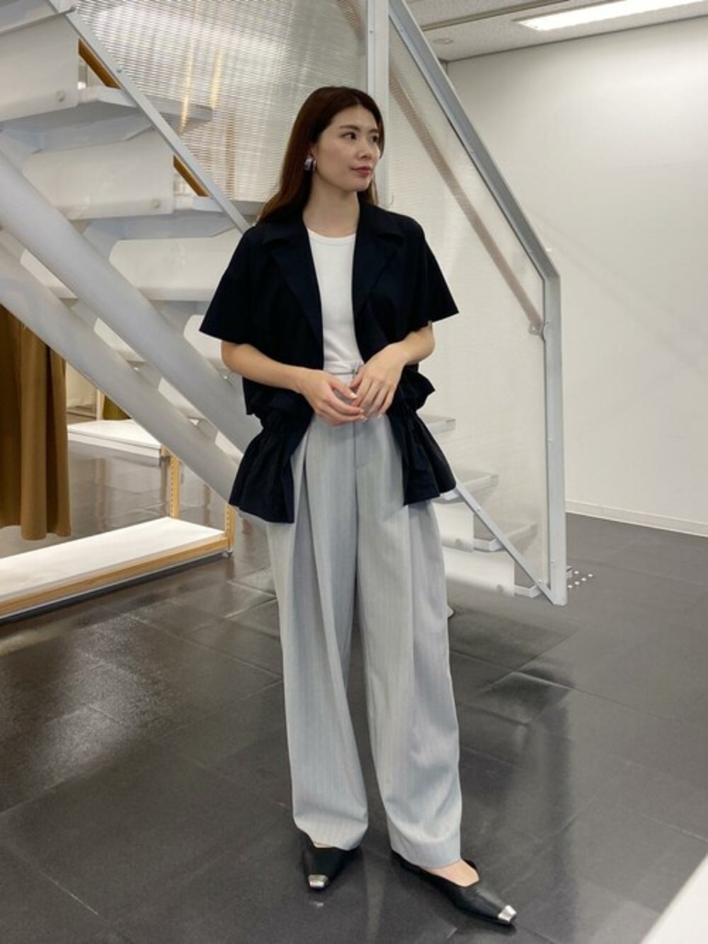 モノトーンコーデが魅力のスタイリング。ブラックのショートジャケットは、ウエストのペプラム部分の取り外しが可能で、 シルエットに変化を加えられる万能アイテム。インナーのホワイトトップスとグレーのワイドパンツを組み合わせ、上品な抜け感を演出。 足元はメタリックトゥのフラットシューズでモードな雰囲気をプラス。 シンプルながらもこなれ感のあるスタイルは、オンオフ問わず活躍し、大人の洗練されたカジュアルコーデにぴったり。