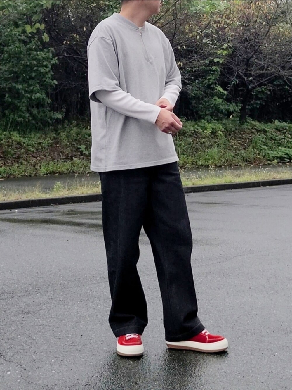 コーデの主役を赤のスニーカーにして、あとはシンプルめにしました 中途半端に肌寒い日はロンTの重ね着で対処